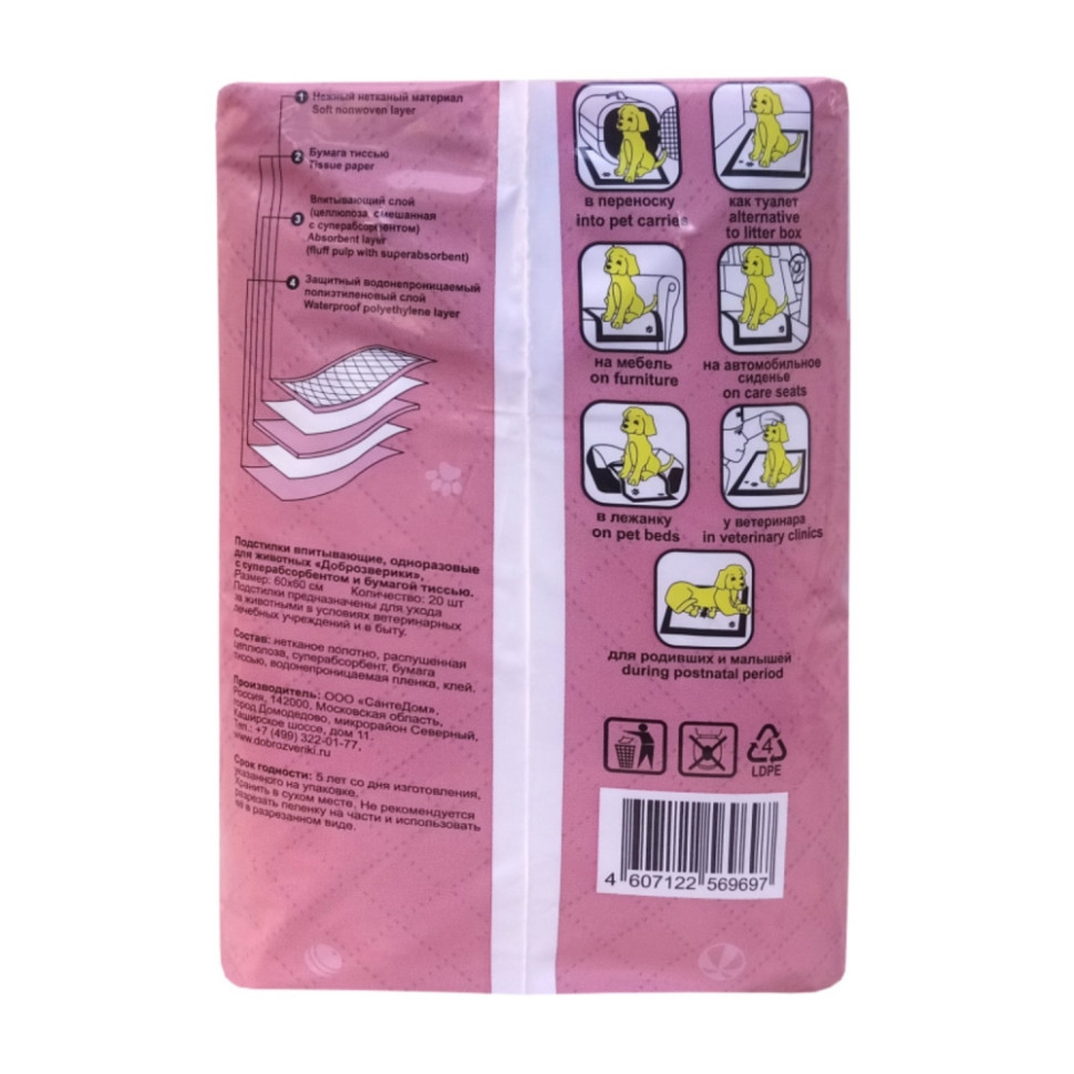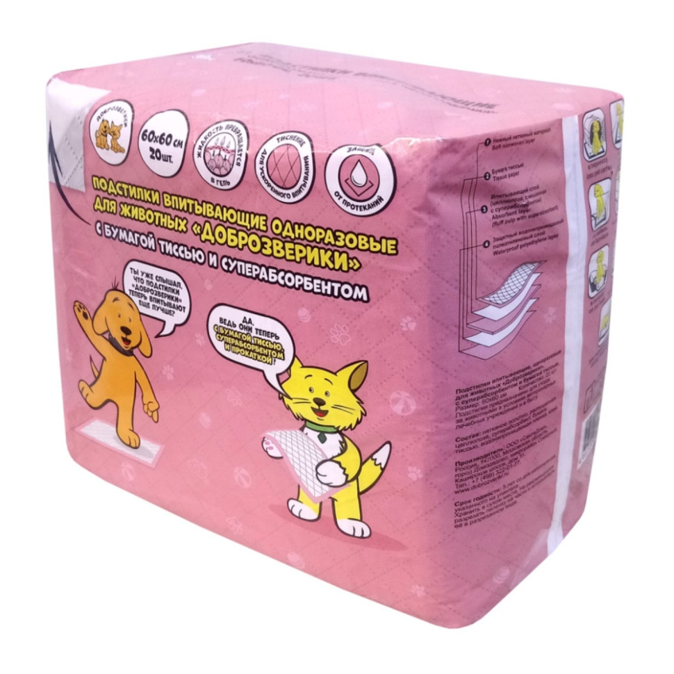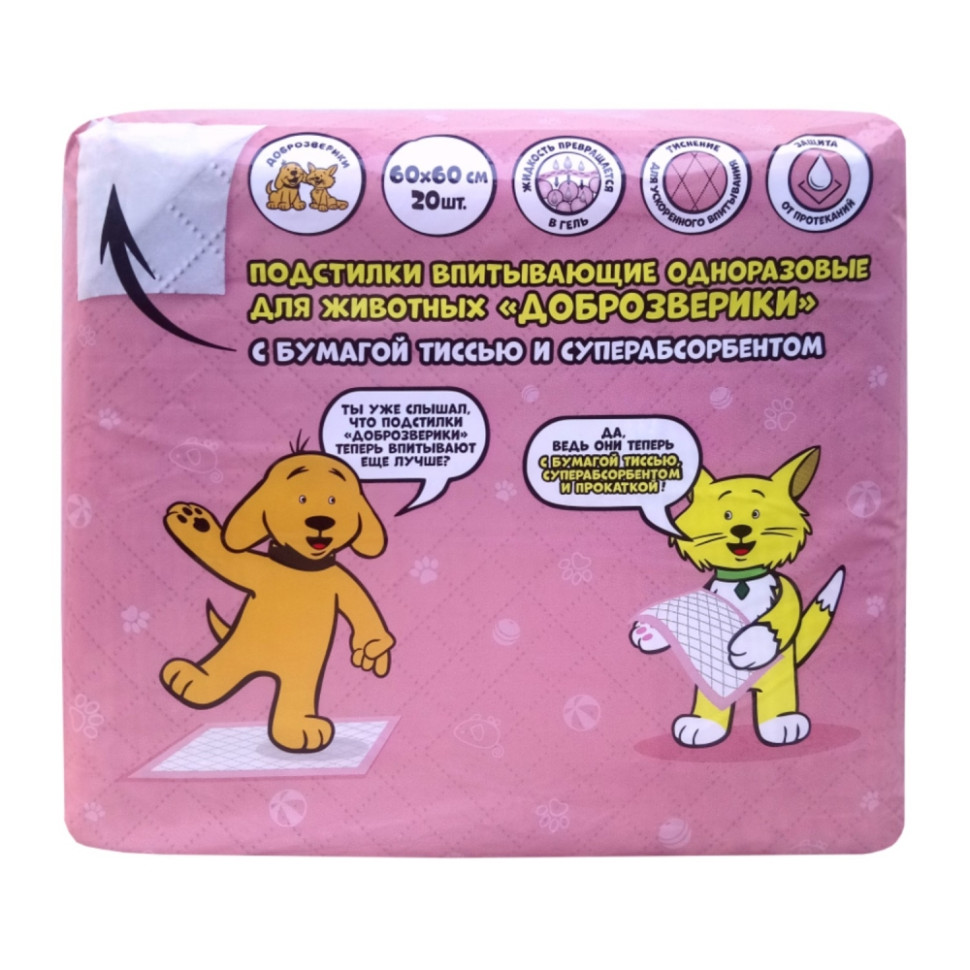 Доброзверики подстилки впитывающие для животных с бумагой тиссью и суперабсорбентом 60х60 см, 20 шт