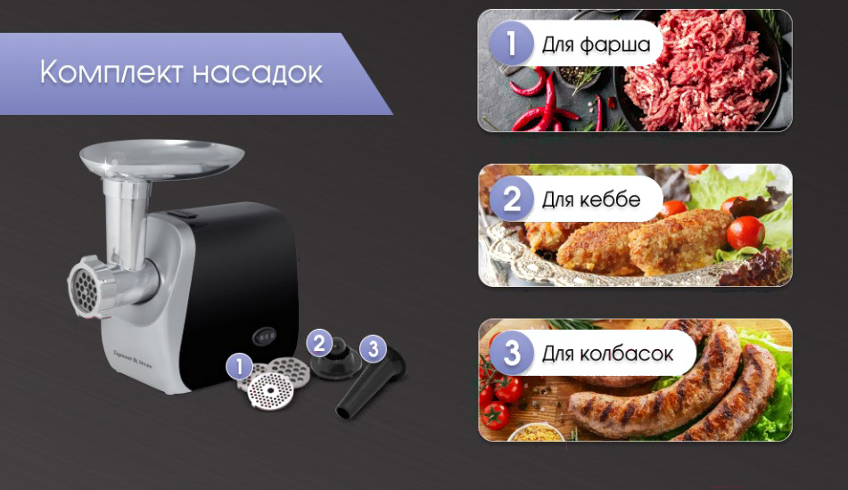 • Насадки диск/решетка для фарша, для «кеббе», для домашней колбасы