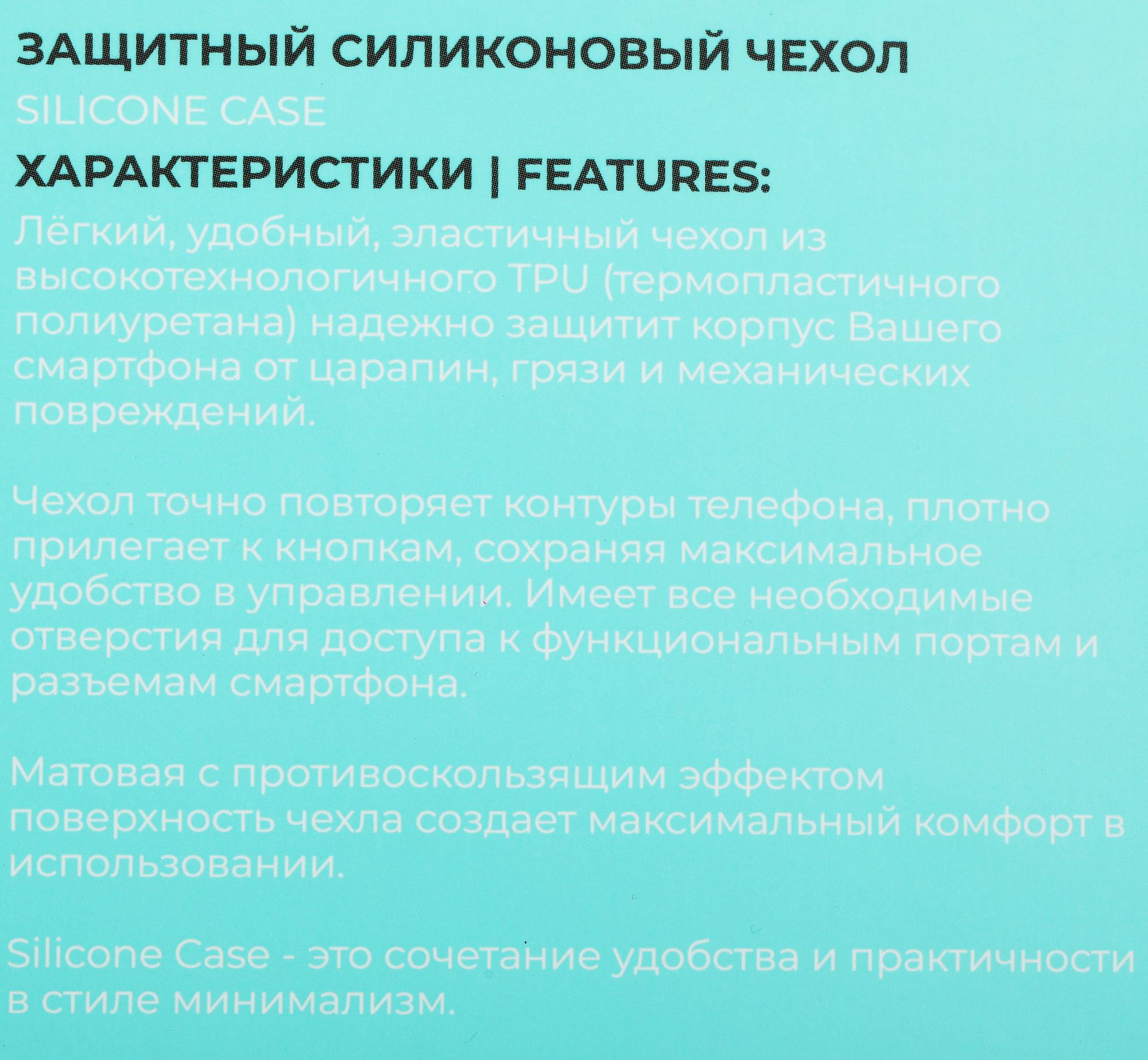 ОписаниеЧехол Silicone Case специально разработан с учётом всех особенностей Вашего смартфона. Благодаря толщине материала не более 0,8мм чехол минимально увеличивает размеры смартфона, при этом защищает заднюю панель от царапин, грязи и пыли, а матовая поверхность предотвращает выскальзывание из рук.