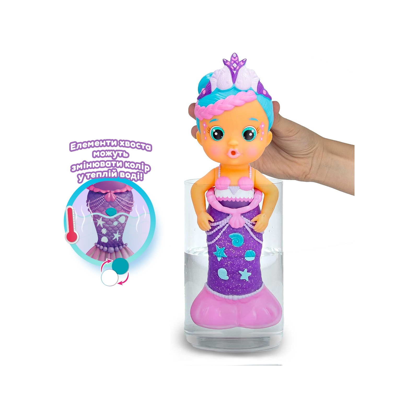 Деякі елементи хвоста можуть змінювати колір, якщо опустити ляльку в теплу воду!