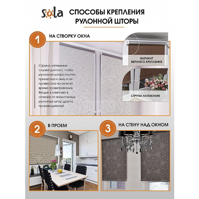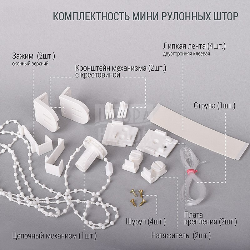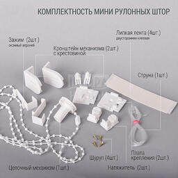 • Комплектация: Комплектность: Штора — 1шт. Цепочный механизм — 1шт. Зажим оконный верхний — 2шт. Кронштейн механизма с крестовиной — 2шт. Плата кронштейна — 2шт. Липкая лента — 4шт. Струна — 1шт. Плата крепления — 2шт. Натяжитель в сборе — 2шт. Скоба — 2шт. Шуруп 3х10 — 4шт