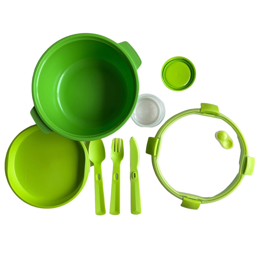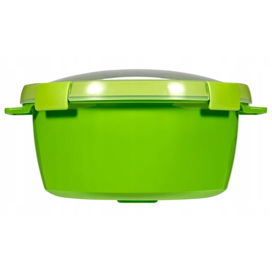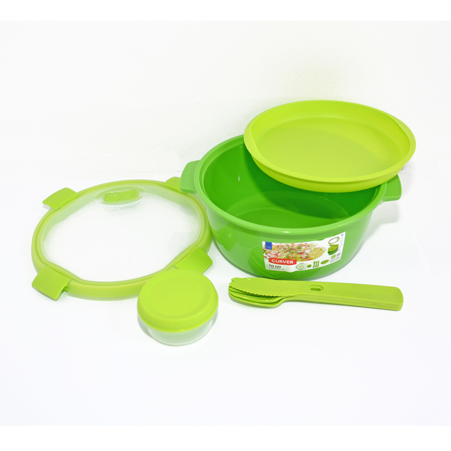 Круглый обеденный контейнер CURVER емкостью 1,6 л. Идеально подходит для хранения больших и легких блюд, особенно различных салатов. Входящий в комплект набор пластиковых столовых приборов, поднос и съемный контейнер для небольшой порции соуса сделают коробку идеальным решением для частых путешественников. 100% герметичная крышка обеспечит длительную свежесть приготовленных блюд и предотвратит вытекание содержимого. Ланчбокс можно использовать в микроволновой печи, поэтому он подойдет и для более сытных блюд, требующих разогрева, например, круп с мясом, макарон, запеканок или супов.