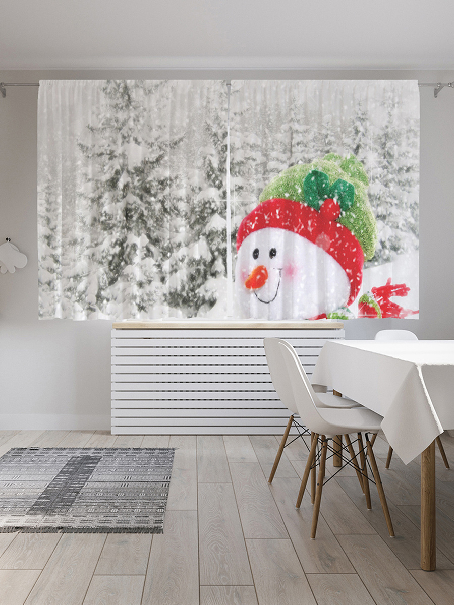Шторы с фотопечатью "Снеговик в заснеженном лесу" из сатена, 145х180 см