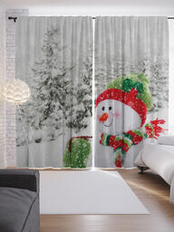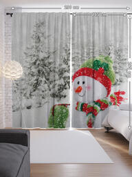 Шторы с фотопечатью "Снеговик в заснеженном лесу" из сатена, 290х265 см
