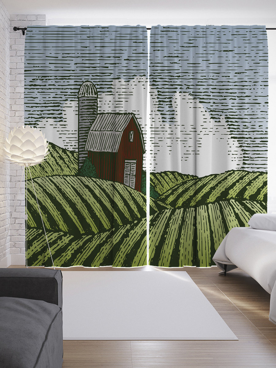 Шторы с фотопечатью "Одинокий дом в полях" из сатена, 145x265 см