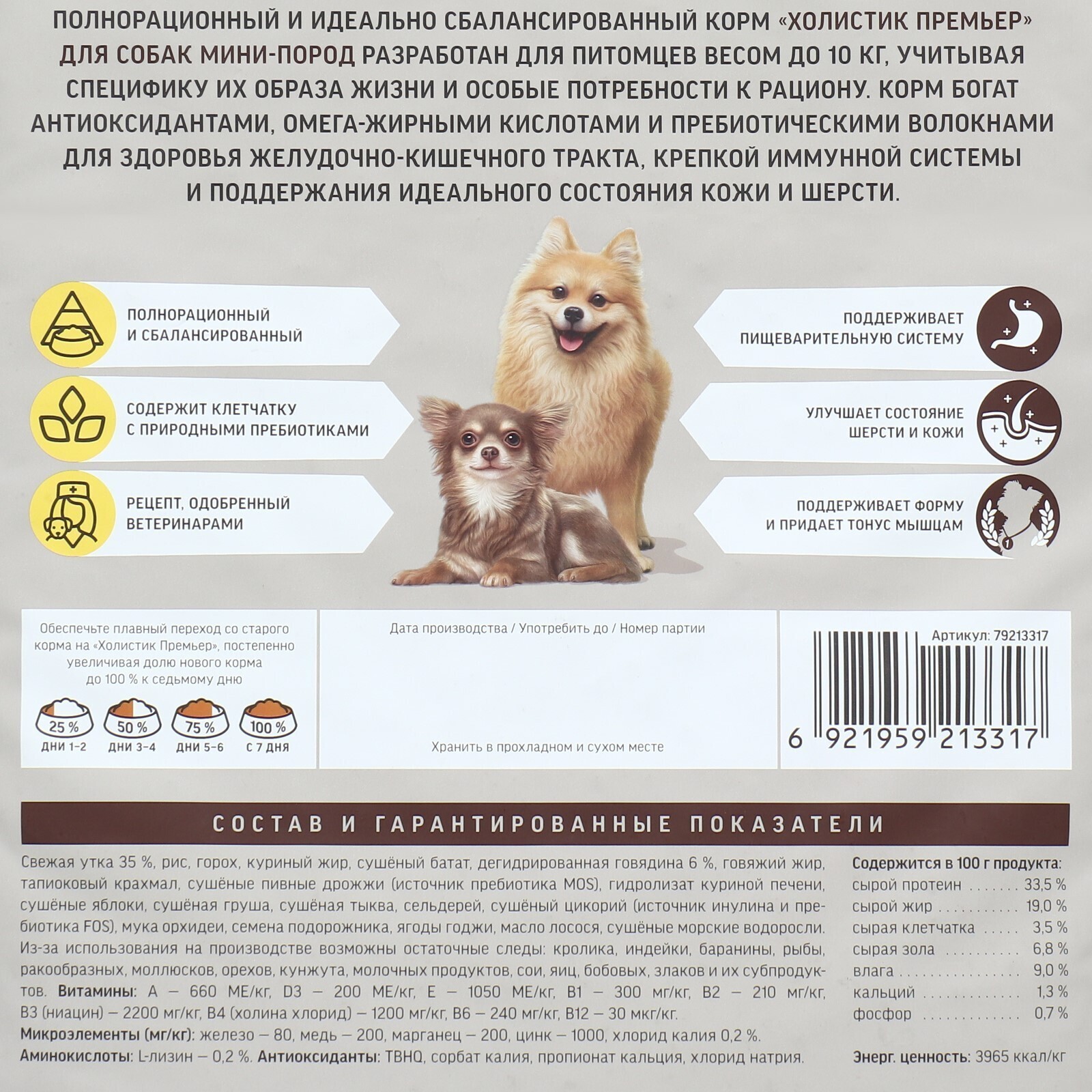 «Холистик премьер» Для взрослых собак мини-пород "Утка с рисом" разработан для животных весом до 10 кг, учитывая специфику их образа жизни и особые потребности к рациону. Корм богат антиоксидантами, омега-жирными кислотами и пребиотическими волокнами, необходимыми для здоровья желудочно-кишечного тракта, крепкой иммунной системы и поддержания идеального состояния кожи и шерсти.