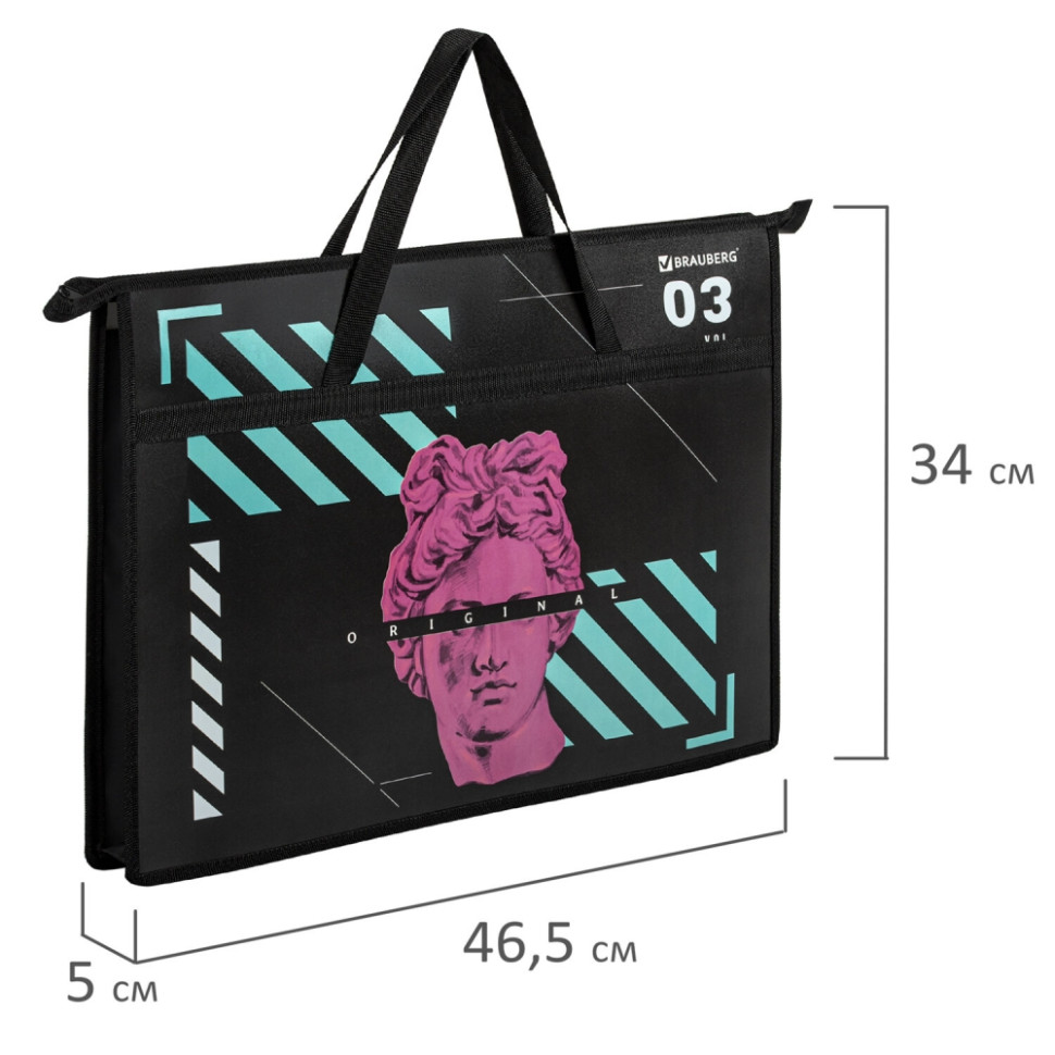 Данное описание относится к 1 единице из набора. Папка BRAUBERG формата А3 предназначена для хранения чертежей, рисунков и других художественных изображений. Выполнена из пластика, по краям имеет тканевую окантовку. Одно отделение. Застежка-молния расположена по верхнему краю папки. Цветная печать. Практичная папка на молнии с ручками защитит чертежи, рисунки и другие художественные изображения от замятий и повреждений. Яркая и четкая печать дизайна с двух сторон. Застегивается на молнию. Ручки из тесьмы. Формат А3. Ширина папки 50 мм. Формат: А3. Серия: DESIGN. Застежка: молния. Материал: пластик. Количество отделений: 1. Наличие ручки: да. Дизайн: The Original. Цвет: черный. Высота: 340 мм. Ширина: 465 мм. Глубина: 50 мм Бренд - BRAUBERG. Производитель - Россия. Артикул - 271436. Штрихкод - 4606224392417