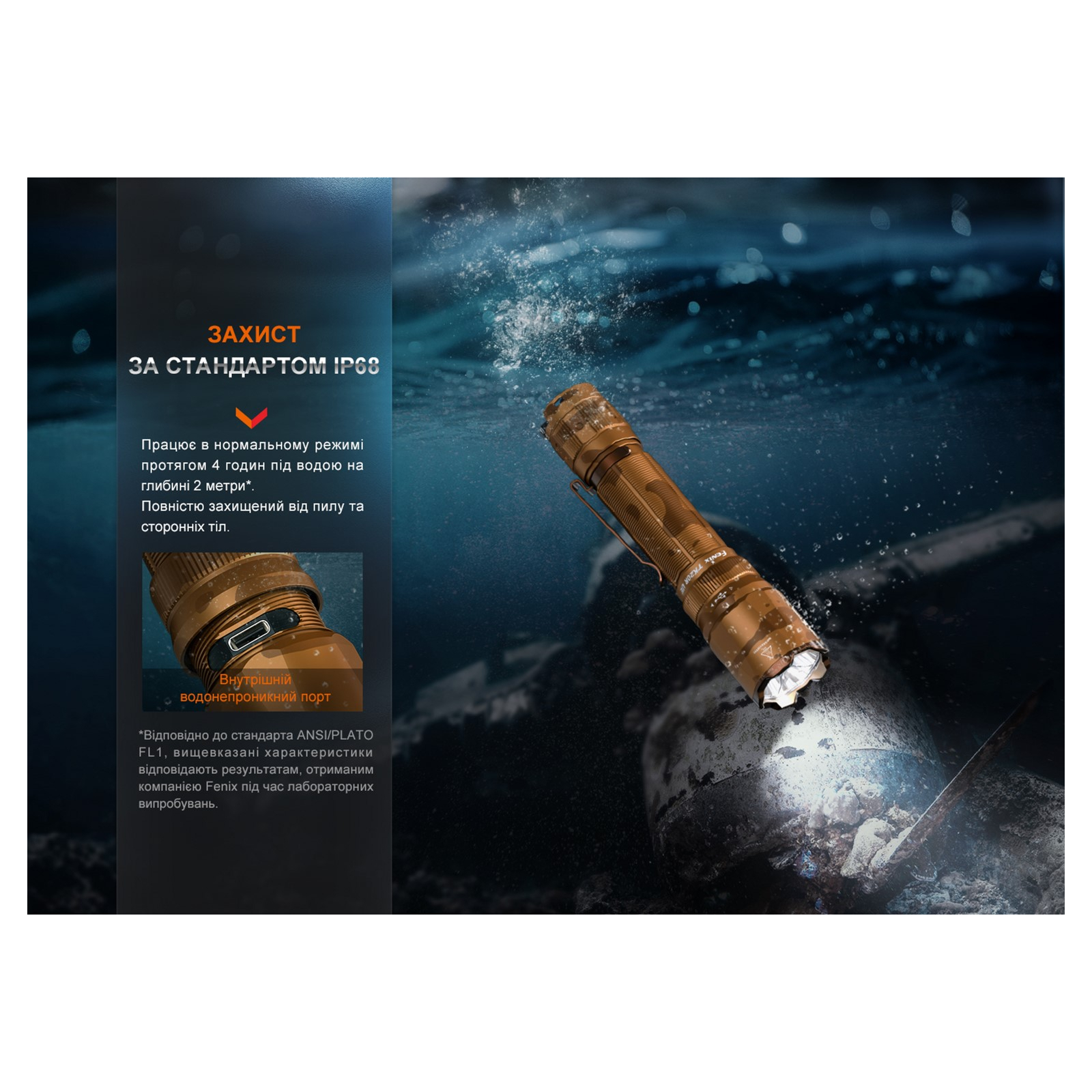 Корпус Fenix TK20R UE имеет размеры 153.7 х 34 х 25.4 миллиметра. Он изготовлен из устойчивого к повреждениям алюминия A6061-T6 с покрытием в виде анодирования премиального класса, которое защищает материал от царапин. Металл имеет ряд преимуществ: он не поддается ржавлению, быстро остывает и противостоит деформированию при ударе о твердую поверхность в случае падения с полутораметровой высоты. На резьбе при откручивании хвостокрышки находится резиновый уплотнитель. Благодаря ему капли жидкости и пыль не попадают внутрь корпуса. Класс пыле- и гидроизоляции — IP68. Осветительное устройство весом 135 грамм можно крепить на ремень, сумку или карман одежды с помощью клипсы съемного типа. Комплект также дополнен темляком на руку и фирменным чехлом для более удобного хранения фонаря. Модель совместима с множеством аксессуаров Fenix, которые повышают ее функциональность: с креплениями ALG-00, ALG-16 M-Lok и ALG-18, c тактическим кольцом ALR-01 и выносной кнопкой AER-05. Перечисленные аксессуары покупаются отдельно.