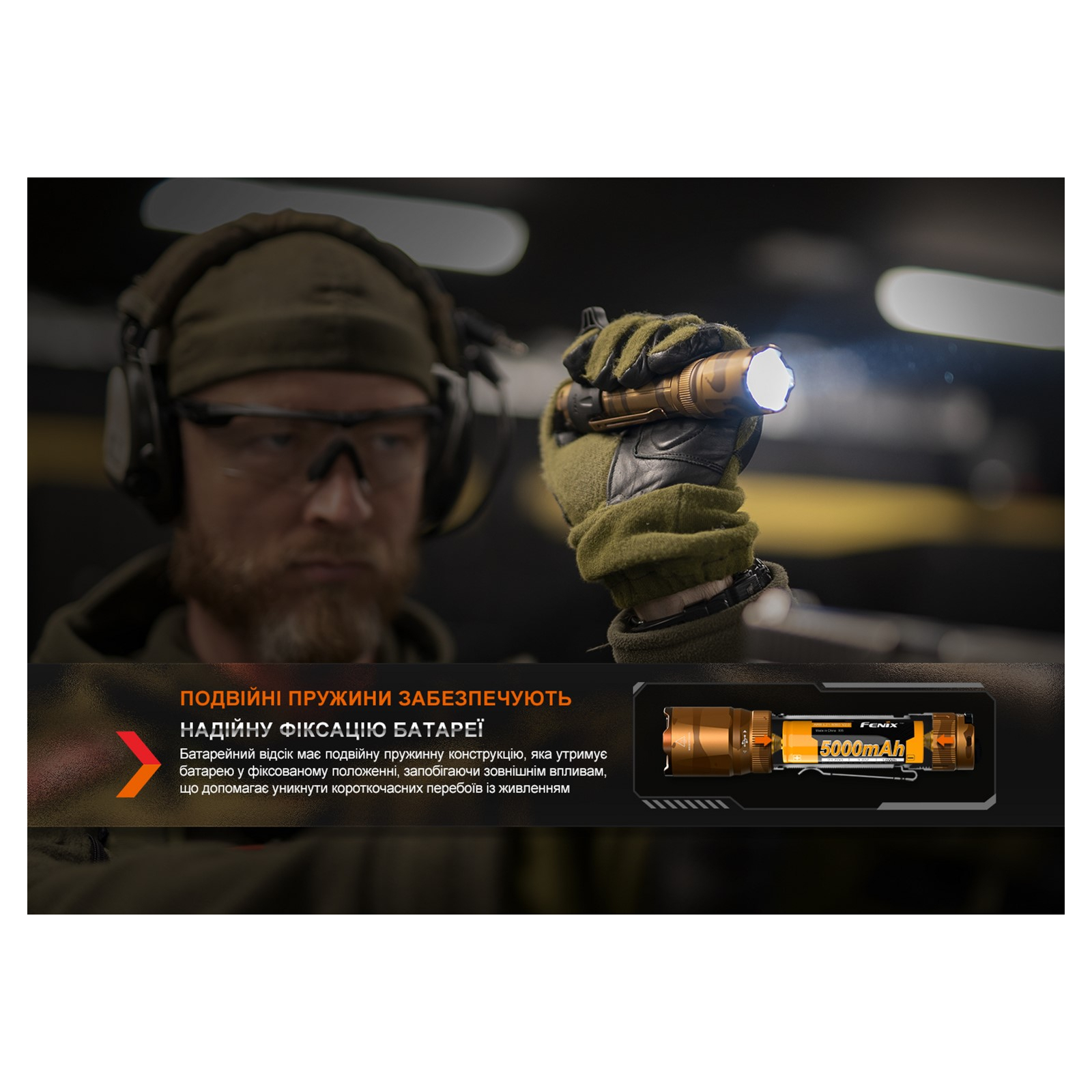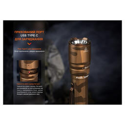 Источник питания Fenix TK20R UE совместим с перезаряжаемыми аккумуляторами 21700 с напряжением 3.6 В. Для питания достаточного одного элемента питания данного типа. Доступ к аккумуляторному отсеку осуществляется при помощи откручивания хвостокрышки. В комплект уже включен фирменный аккумулятор ARB-L21-5000 V2.0, который разработан специально для питания устройств с высоким потреблением. Вместо него можно использовать ARB-L21-5000U, ARB-L21-4000P или элементы от других производителей, если пользователь уверен в их качестве. Стоит иметь в виду, что элементы питания 18650, 16340 и CR123A не совместимы с данной моделью. Чтобы упростить зарядку аккумулятора, производитель встроил зарядный порт USB Type-C в корпус фонаря. Требуется слегка открутить голову конструкции, чтобы обнажить порт, и подсоединить к нему соответствующий кабель, который также можно найти в комплекте. Средняя продолжительность зарядки равна 4 часам.