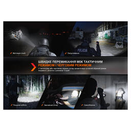 В тактическую группу входит несколько основных вариантов освещения: Турбо и мигающий стробоскоп, который предназначен для моментальной дезориентации противника, а также подходит для подачи световых сигналов. Служебная группа включает четыре режима с постоянным освещением мощностью от 30 люмен и выше.