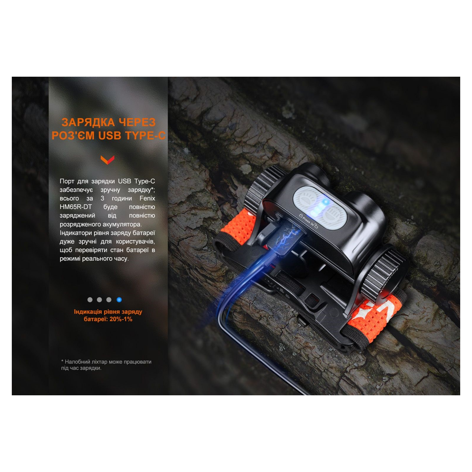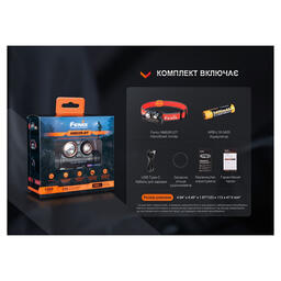 Мощность освещения меняется от наименьшей до самой высокой. Для предотвращения включения фонаря во время транспортировки и экономии заряда элементов питания, рекомендуется активировать электронную блокировку после каждого использования. Чтобы это сделать, нужно нажать и удерживать любой переключатель в течение 3-х секунд, пока осветительное устройство четырежды не мигнет теплым лучом. С этой целью также можно одновременно зажать обе кнопки управления, что подходит и для разблокировки фонаря. Источник питания Фонарь HM65R-DT функционирует при напряжении 3.6 В, а рабочий ток составляет 4.2 А. Номинальная мощность модели равна 15 Вт. Необходимыми характеристиками для питания устройства обладает брендовый Li-ion аккумулятор 18650, который имеет емкость 3400 мАч. Как альтернатива допускается применение пары батареек CR123A. При условии использования фирменного аккумулятора пользователю доступны несколько полезных функций: зарядка элемента питания в течение 3-х часов через встроенный в корпус порт USB Type-C и индикация уровня заряда аккумулятора, которая позволяет контролировать оставшуюся часть заряда элемента и своевременно заряжать его или заменять на новый. Индикация включается кликом любой кнопки управления, когда фонарь выключен: 4 индикатора: 100% - 80%; 3 индикатора: 80% - 60%; 2 индикатора: 60% - 40%; 1 индикатор: 40% - 20%; Мигание индикатора: 20% - 1%.