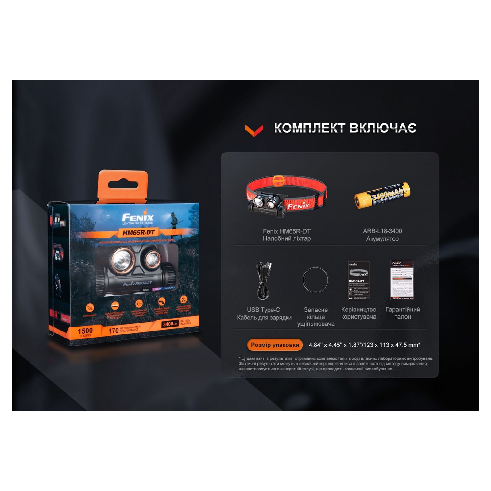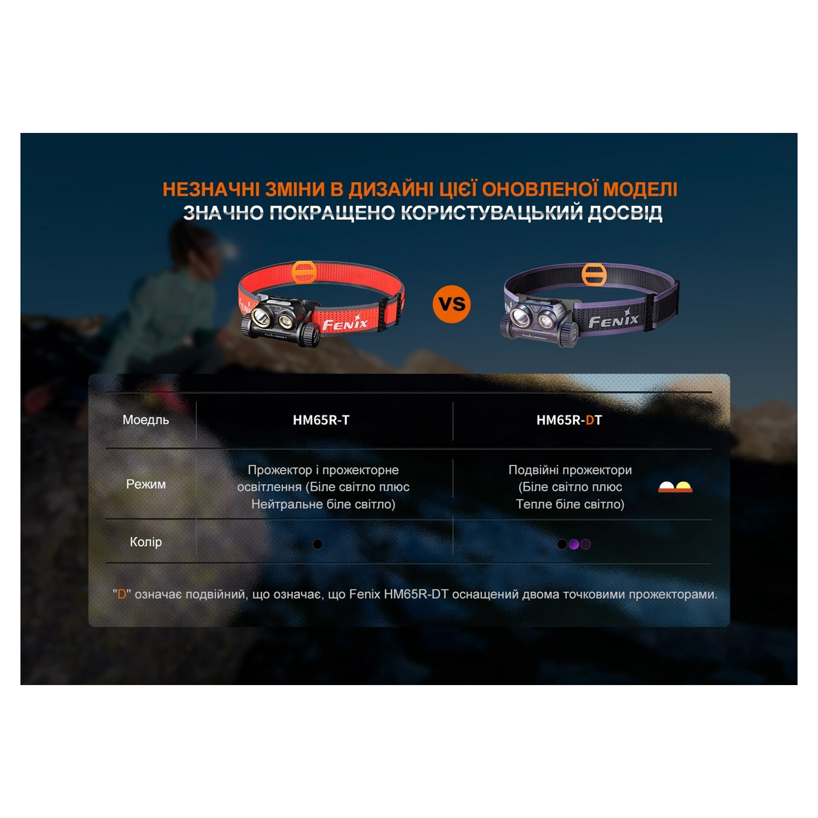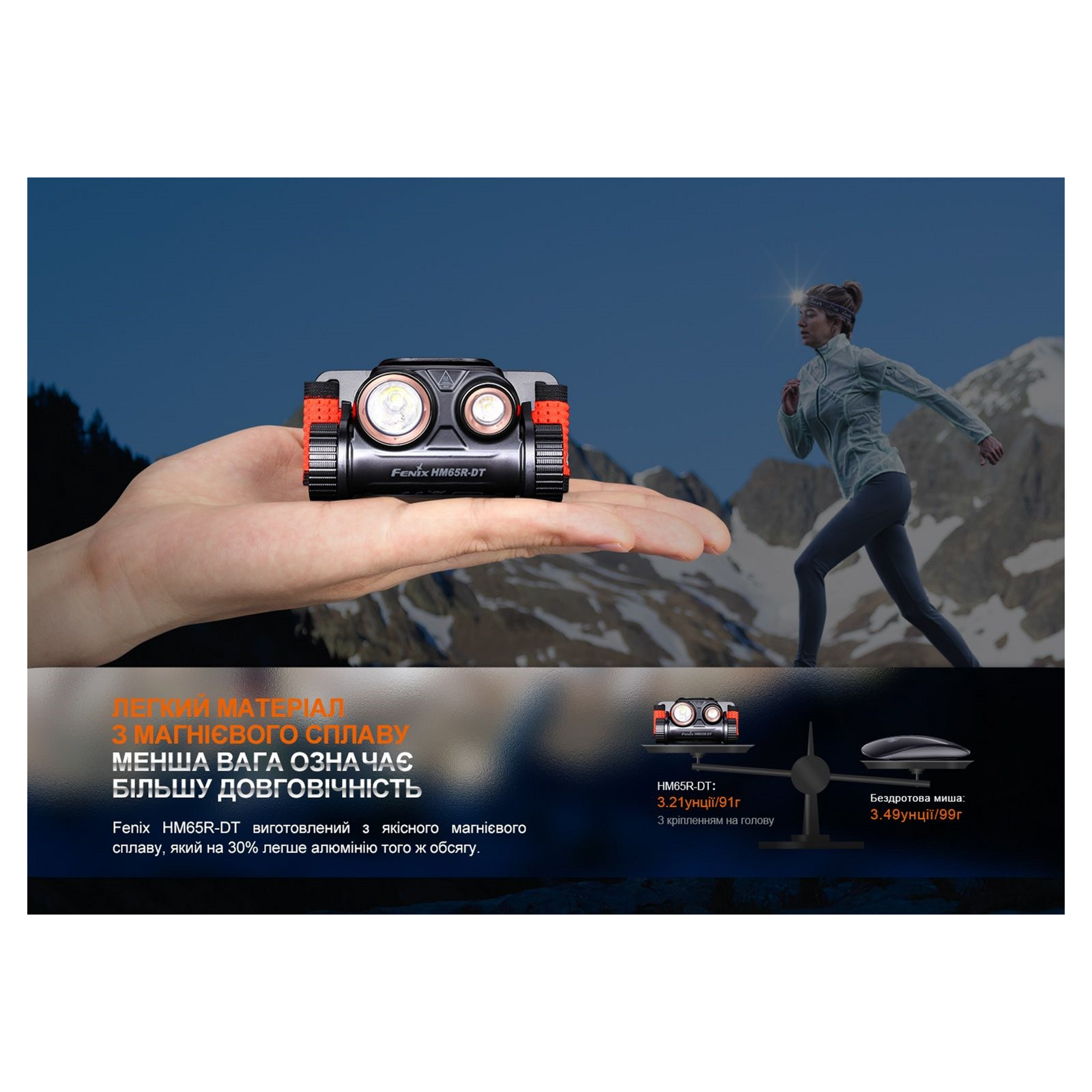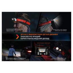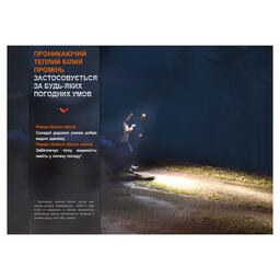 Функциональные особенности и конструкция Fenix HM65R-DT разработаны с учетом потребностей спортсменов, которые не привыкли отказываться от тренировок в темное время суток. Фонарь с налобным креплением также подходит для туризма и активного отдыха, поскольку освещает дистанцию до 170 метров и при этом освобождает обе руки для других действий. В модели присутствует два рефлектора — в каждом по одному светодиоду. С одной стороны это белый диод Luminus SST40 с цветовой температурой света 6500К, с другой — Luminus SST20 с теплым лучом 3000К. Светодиоды работают по отдельности и имеют разные параметры света: max яркость белого освещения достигает 1300 люмен, а яркость теплого луча — 400 люмен. Однако данные элементы имеют одну схожую характеристику — узконаправленный луч света, который подходит для точечного освещения отдельных предметов.