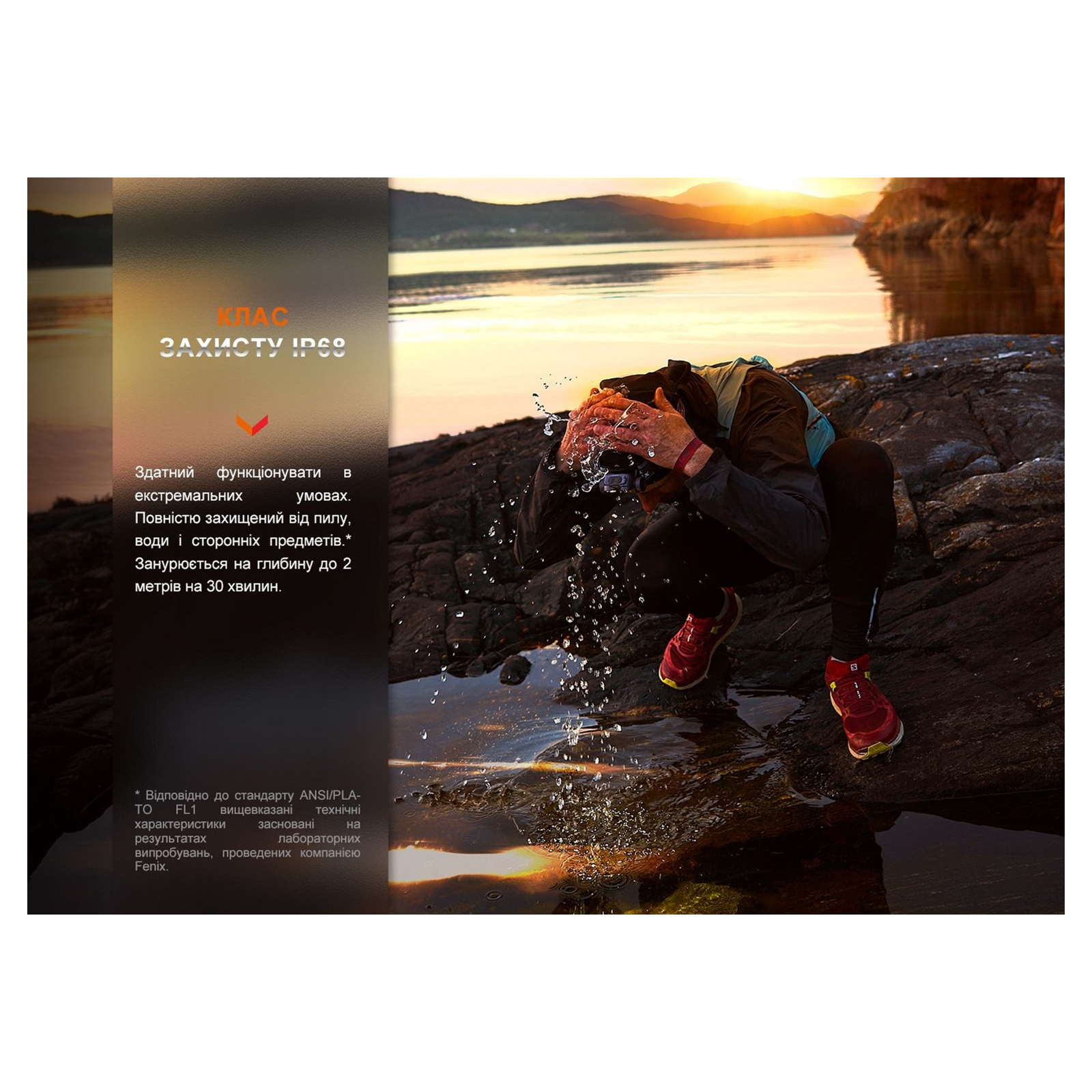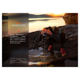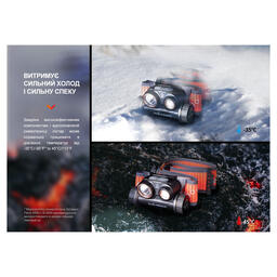 Достоинством модели, полезным для эксплуатации на открытом воздухе, является 100% гидроизоляция согласно классу IP68. В каких условиях ни использовалось бы устройство, внутрь корпуса не проникнет влага, грязь и песчинки. Размеры основной части конструкции составляют 80 х 47 х 39 миллиметров. В комплект с фонарем и аккумулятором добавлено перфорированное оголовье. Его ширина равна 36 миллиметрам. Дизайн резинки дополняют не только светоотражающие вставки, но и запатентованный механизм изменения длины, который управляется взаимодействием с вращающимся клапаном. Регулирование длины налобного крепления осуществляется одним движением руки во время ношения фонаря, что особенно удобно во время тренировки.