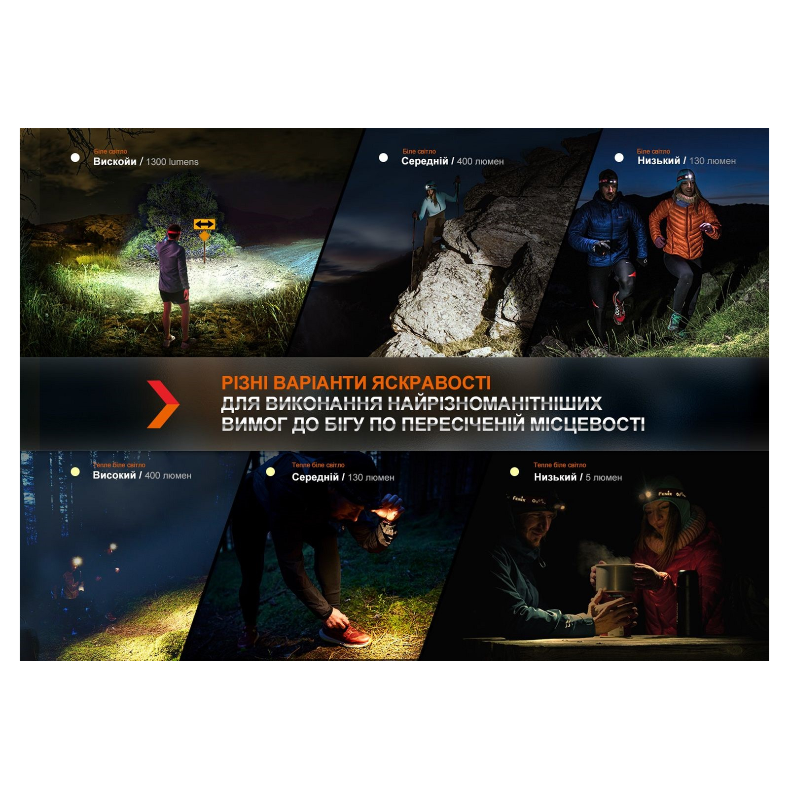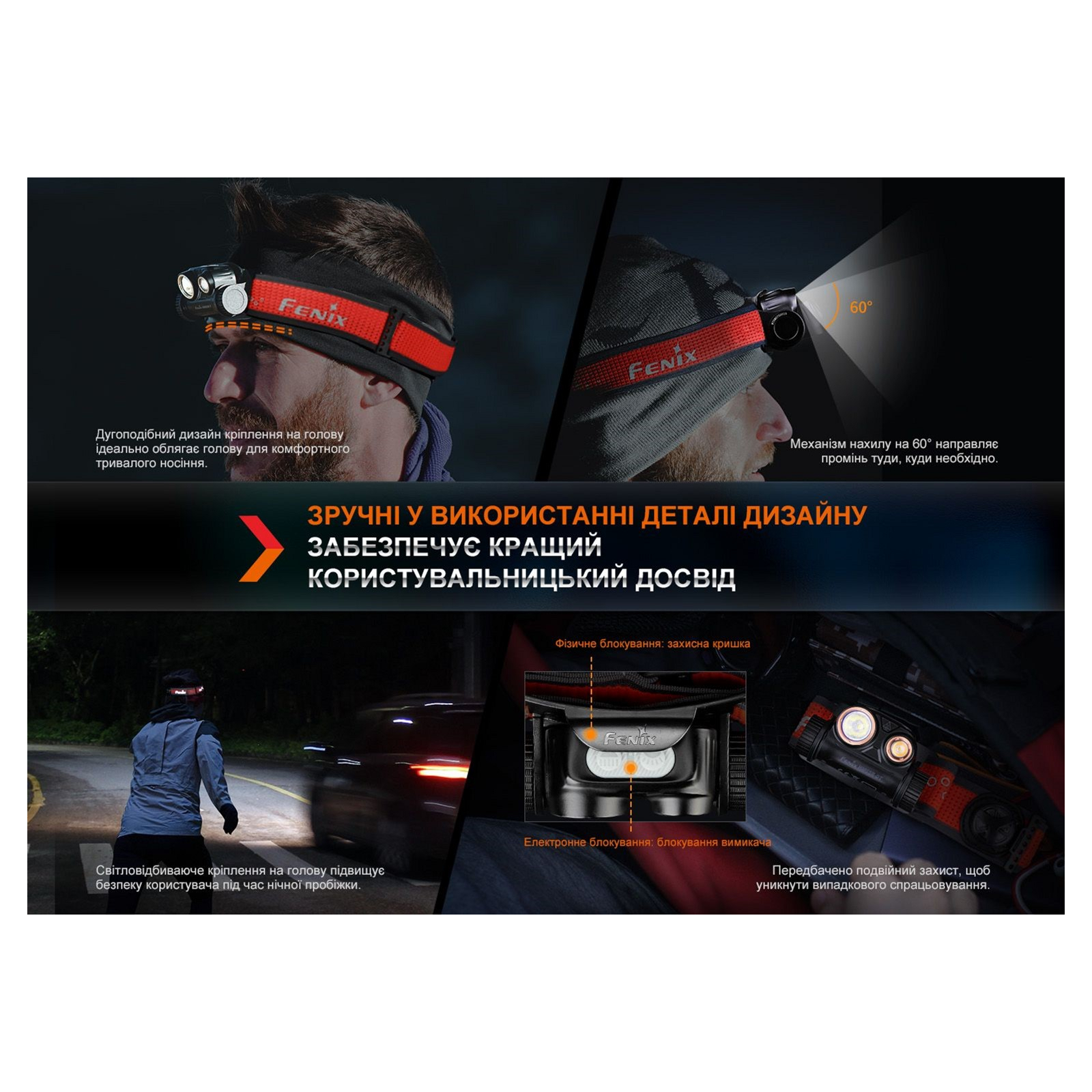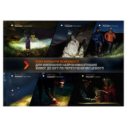 Во время ношения фонаря на голове пользователь может выставлять комфортный угол освещения, используя его для подсветки пути под ногами или дальних объектов. Зафиксированная на креплении модель регулируется в пределах 60°. Каждый из светодиодов может работать в трех режимах с пошаговым возрастанием яркости, начиная от 5 люмен.