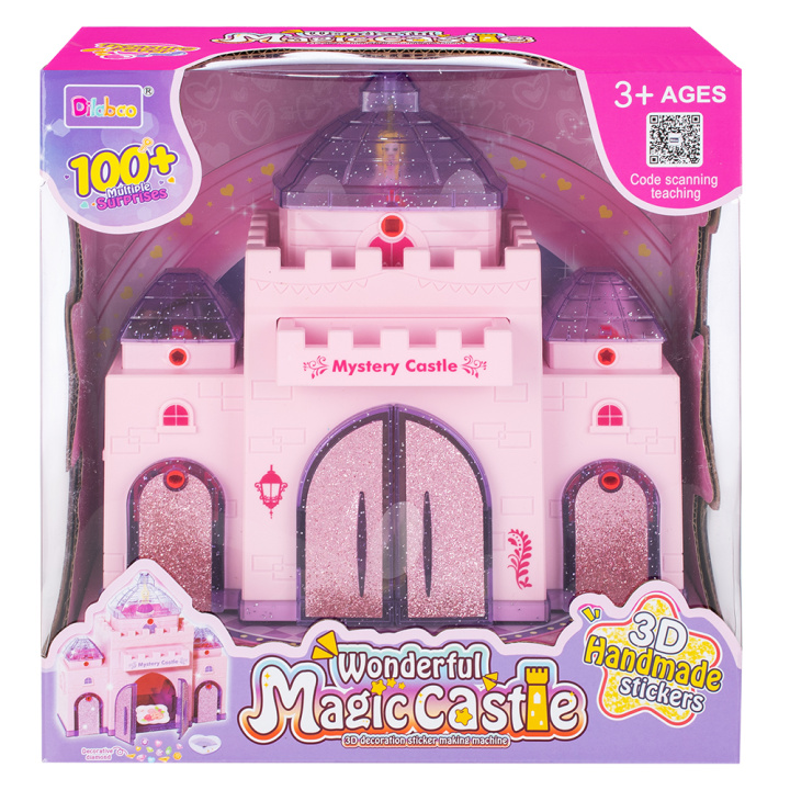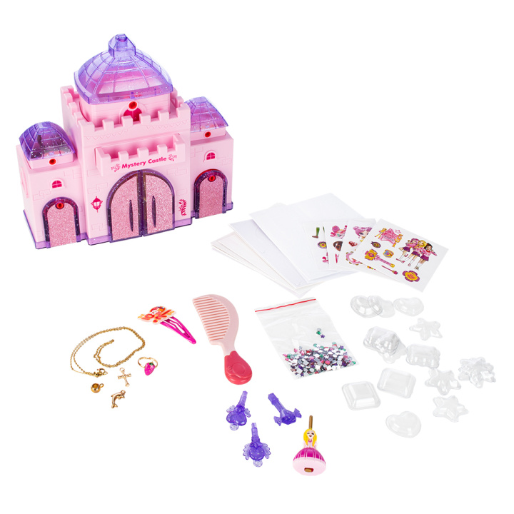 Набор для создания объемных наклеек «Замок» с бижутерией. С помощью набора можно создать 26 объемных прозрачных стикеров 4 форм со стразами внутри. Для этого необходимо выдвинуть ящик из машинки для создания стикеров, поместить туда бумажную форму для стикера, в эту форму поместить соответствующую прозрачную заготовку для стикера, внутрь прозрачной заготовки засыпать стразы, накрыть картонным основанием для стикера рисунком вниз, задвинуть ящик внутрь машинки и нажать на кнопку сверху. Готовый стикер окажется в нижней части замка за дверцами. На оборотную сторону стикера необходимо наклеить липкий слой. Замок также может служить в качестве шкатулки. Крыша замка и боковые дверцы закрываются на ключ.