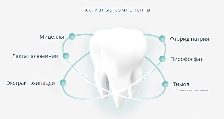 - Активные ингредиенты тимол, фторид натрия, ментол, экстракт эхинацеи, лактат алюминия, пирофосфат, антисептик