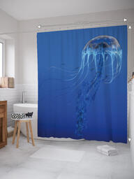 Штора (занавеска) для ванной "Опасная медуза" из ткани, 180х200 см с крючками