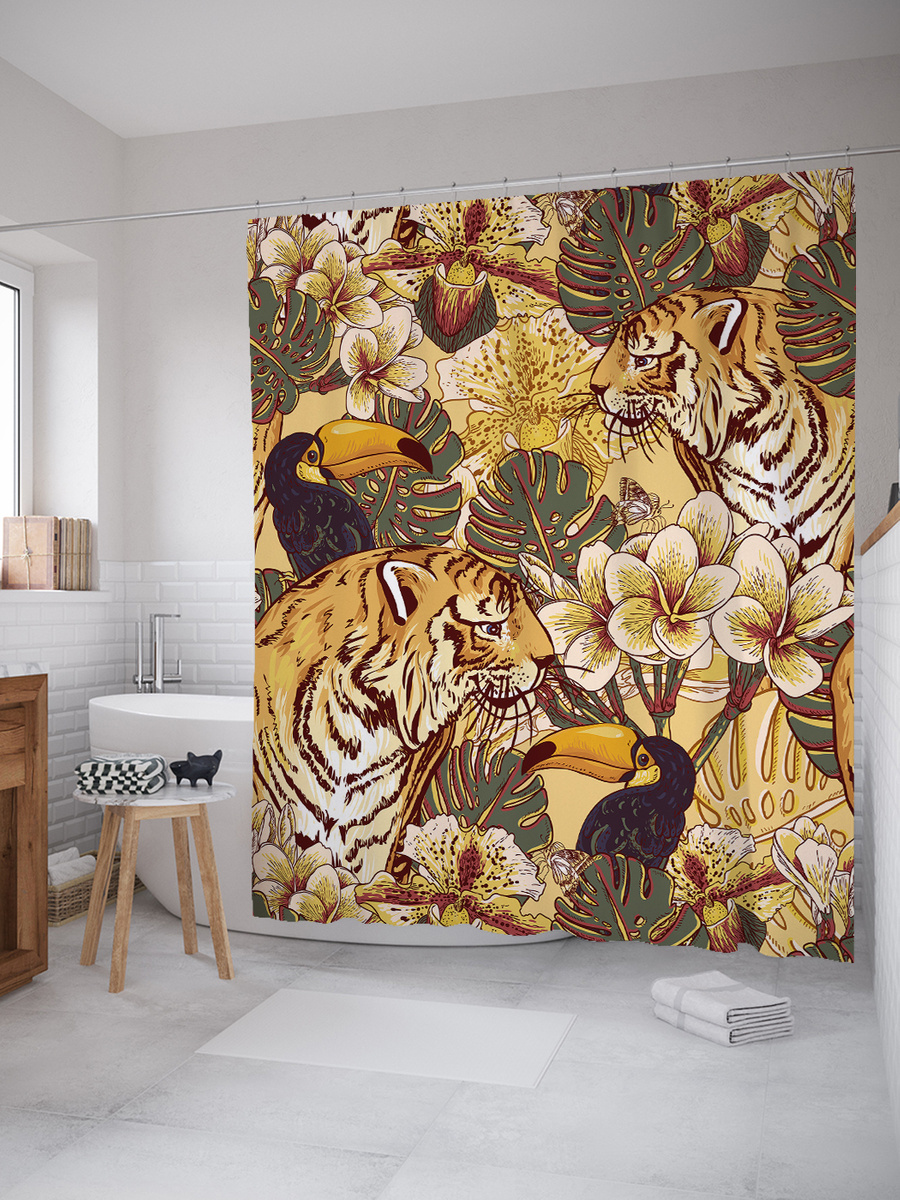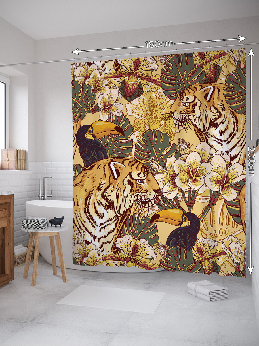 Штора (занавеска) для ванной "Тигры в цветах с туканами" из ткани, 180х200 см с крючками