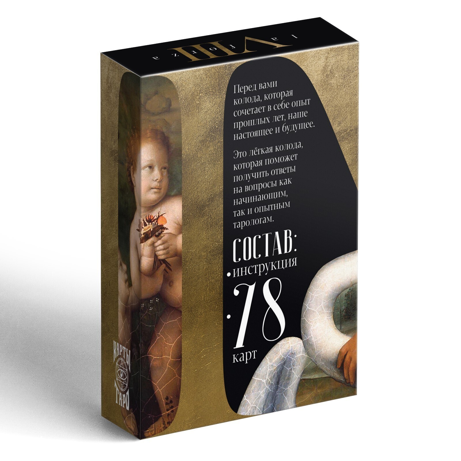 Таро — древнее и популярное карточное гадание. Оно позволяет найти ответы на вопросы разного рода, а также получить совет от карт, понять причины своих поступков и поведения других людей. Колода карт Таро «Экспонат» несёт в себе опыт прошлых лет, сочетает наше настоящее и будущее. Эта универсальная лёгкая колода будет одинаково открыта как начинающим, так и опытным тарологам.