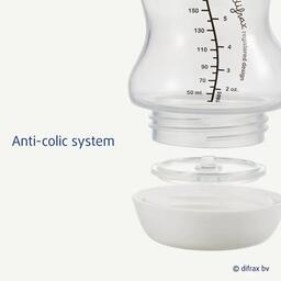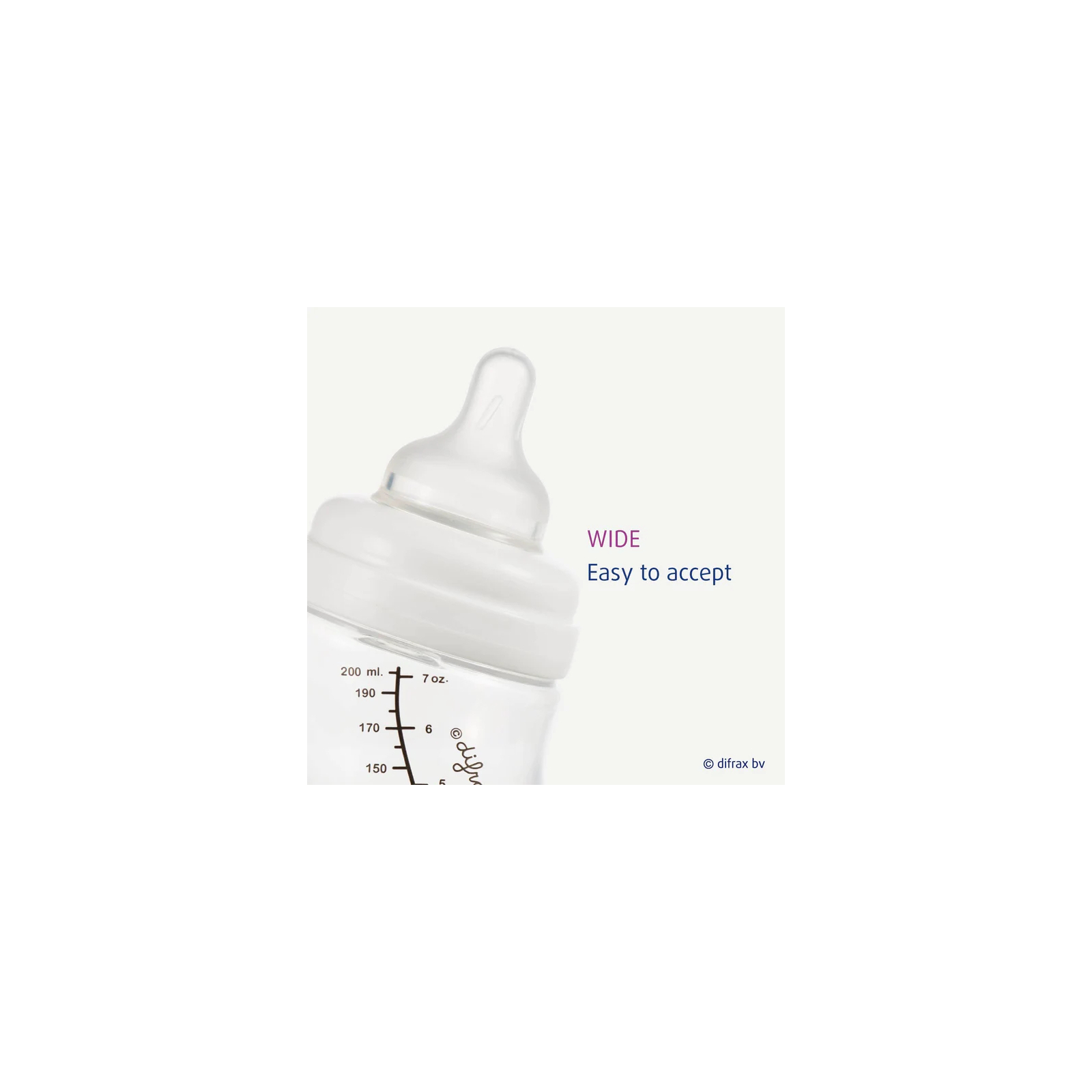 Скляні пляшечки Anti-Colic S виготовлені з дуже міцного та довговічного боросилікатного скла. Це скло легше за звичайне, безпечне та довговічне. Міцне скло запобігає пошкодженню або подряпинам, в яких можуть розмножуватися бактерії. Це забезпечує скляній S-подібній пляшці надзвичайно довгий термін служби. Міцне скло є ударостійким, але не небитким. Скляна S-поїлка 310 мл має запатентовану антиколікову систему на дні для запобігання кишкових спазмів, відрижки та зригування. Скляна S-подібна пляшечка об'ємом 310 мл підходить для грудного вигодовування або годування з пляшечки і поставляється з маленькою силіконовою соскою. Спеціальне покриття соски Difrax забезпечує додаткове зчеплення. Соска для пляшечки має м'яку круглу соскоподібну форму, що нагадує материнські груди. Це дозволяє легко поєднувати годування з пляшечки та з грудей. Дитяча пляшечка Wide S має широку соску для пляшечки.