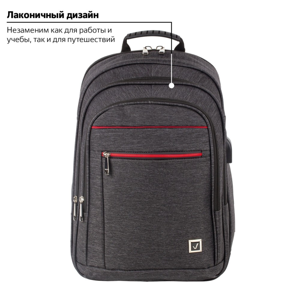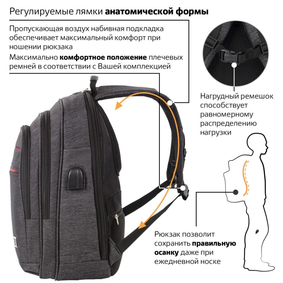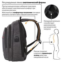 Вместительный и многофункциональный рюкзак с отделением для ноутбука. Эргономичная вентилируемая спинка и лямки способствуют максимальному комфорту. Молния-расширитель, потайной карман на спинке багажная лента делают эту модель еще более универсальной. Этот рюкзак - воплощение идеальной функциональной организации. В нем есть все, чтобы сделать вашу жизнь комфортнее. Отделение для ноутбука со специальной противоударной подушкой обеспечивает безопасную и удобную переноску устройства.Встроенный USB - порт поможет всегда оставаться на связи. Для любителей музыки есть специальный разъем для наушников.Молния-расширитель в случае необходимости позволит увеличить объем рюкзака за несколько секунд. Нагрудный ремешок позволяет снять часть нагрузки с плеч. Помогает лучше зафиксировать рюкзак на теле, уменьшить его колебания, тем самым облегчая переноску.Отличное конструктивное решение - потайной карман на спинке. Он не только защитит важные документы и ценные вещи, но и обеспечит быстрый доступ к ним. Для защиты содержимого в сильный дождь предусмотрен чехол, который расположен в специальном кармане на дне рюкзака.Укрепленная эргономичная спинка рюкзака оснащена системой циркуляции воздуха и обеспечивает удобное прилегание к спине для комфортной ежедневной носки. Эргономичные регулируемые плечевые ремни анатомической формы, оснащенные пропускающей воздух набивной подкладкой, обеспечивают максимальный комфорт при ношении рюкзака.Багажная лента позволяет зафиксировать рюкзак на телескопической ручке чемодана для удобного перемещения нескольких предметов багажа.Меланжированная структура ткани делает этот рюкзак стильным и выделяет среди прочих. Рюкзак изготовлен из надежного практичного материала, стойкого к износу и легкого в уходе - полиэстера. Фирменные брендированные металлические бегунки и логотип BRAUBERG - это не просто элементы дизайна, это гарантия качества от известного бренда.Отличительной особенностью этого рюкзака является вместительность – его объем составляет 36 литров. В основном отделении рюкзака можно легко и быстро разместить личные вещи, а также воспользоваться отсеком для ноутбука. Карман-органайзер включает многочисленные кармашки для пишущих принадлежностей, мобильного телефона, документов и карты памяти. Рюкзак идеально подходит для ежедневной эксплуатации - на работу, учебу и для передвижений по городу.Рюкзак легко открывать и закрывать одной рукой с любой стороны - основное отделение имеет долговечную реверсивную молнию с двумя металлическими бегунками.Нести рюкзак будет удобно не только на плечах, но и в руке за прочную уплотненную ручку.Рюкзак упакован в плотный ПЭТ пакет, который сохранит качество и товарный вид при хранении и транспортировке.Рюкзаки и ранцы BRAUBERG - это высокое качество и проработанные до мелочей модели с современным дизайном и широким функционалом. На протяжении 15 лет наши специалисты сосредоточены на разработке, производстве и совершенствовании рюкзаков для взрослых и детей. Именно поэтому BRAUBERG выбирают дети и родители по всей стране. Совместим с диагоналями экрана: 13", 14", 15". Серия: FUNCTIONAL. Тип рюкзака: универсальный. Количество основных отделений: 2. Количество карманов: 5 шт.. Количество карманов из эластичной сетки: 0 шт.. Количество лямок: 2 шт.. Вентилируемая 