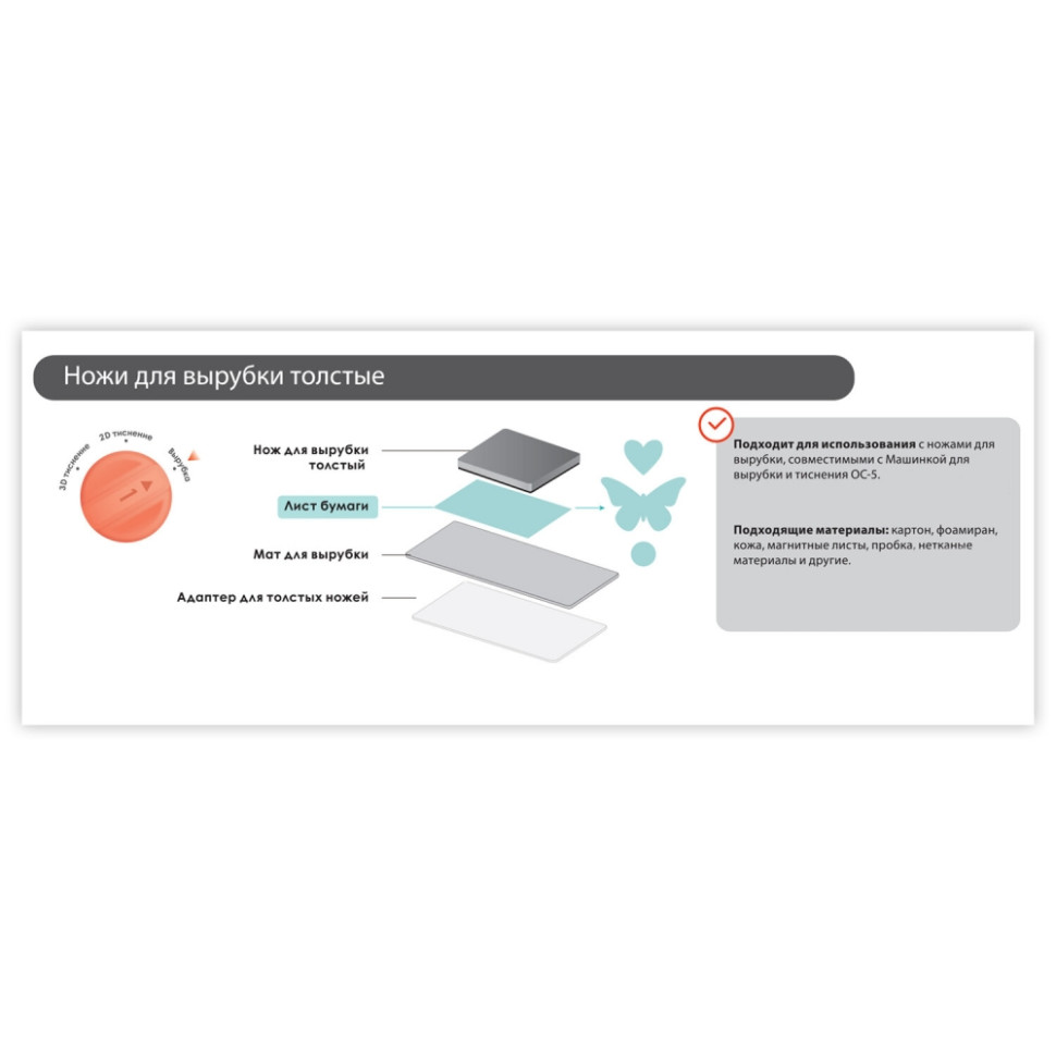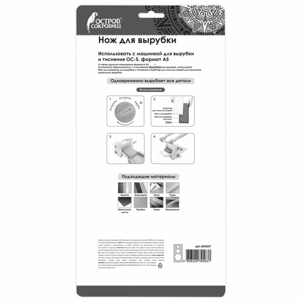 Ножи для вырубки ОСТРОВ СОКРОВИЩ - это пластины с мощными фигурными ножами, позволяющие легко и быстро создавать вырубки из множества различных материалов: картон, фоамиран, фетр, кожа, пробка и другие. Используются с машинкой для вырубки и тиснения ОС-5. Стальной нож в виде цельной пластины размером 15х30 см и толщиной 1,4 см позволяет одновременно вырубить 3 детали в форме шестиугольников размерами 50 мм, 76 мм и 127 мм (включая припуск на шов).Мощный нож позволяет без труда работать с бумагой, картоном, фоамираном, фетром толщиной до 4 мм, тканью, мешковиной, магнитными листами, пробкой, кожей и другими материалами.Для работы необходимо следовать инструкции на оборотной стороне упаковки.Используется только совместно с машинкой для вырубки и тиснения ОС-5 и другими машинками формата А5. Для создания вырубок при помощи пластины с ножами необходим адаптер для толстых ножей и мат для вырубки (входят в набор машинки для вырубки и тиснения ОС-5). Размер пластины: 150х300х14 мм. Толщина: 14 мм. Рисунок: шестиугольник. Серия: Толстые ножи для вырубки. Количество элементов: 1 шт.. Материал: ножи из углеродистой стали. Упаковка: блистер с европодвесом Бренд - ОСТРОВ СОКРОВИЩ. Производитель - Китай. Артикул - 867-007. Штрихкод - 4606224305837