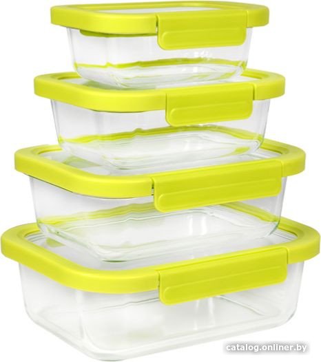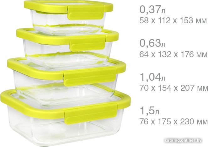 • Размеры контейнеров в наборе Длина: 23 см (20.7, 17.6, 15.3 см).Ширина/диаметр: 17.5 см (15.4, 13.2, 11.2 см).Высота: 7.6 см (7, 6.4, 5.8 см).