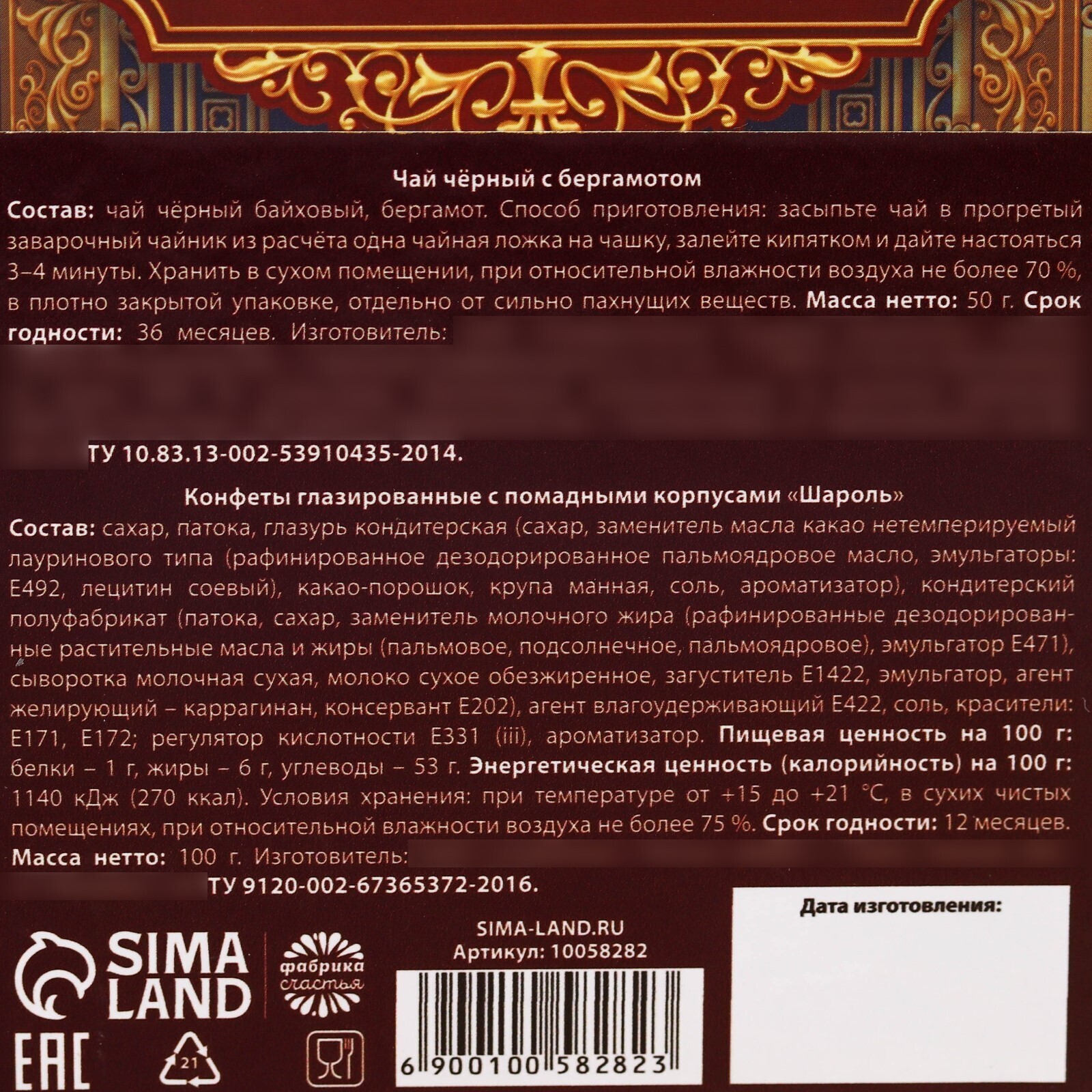 • Составляющие набора Конфеты, Чай