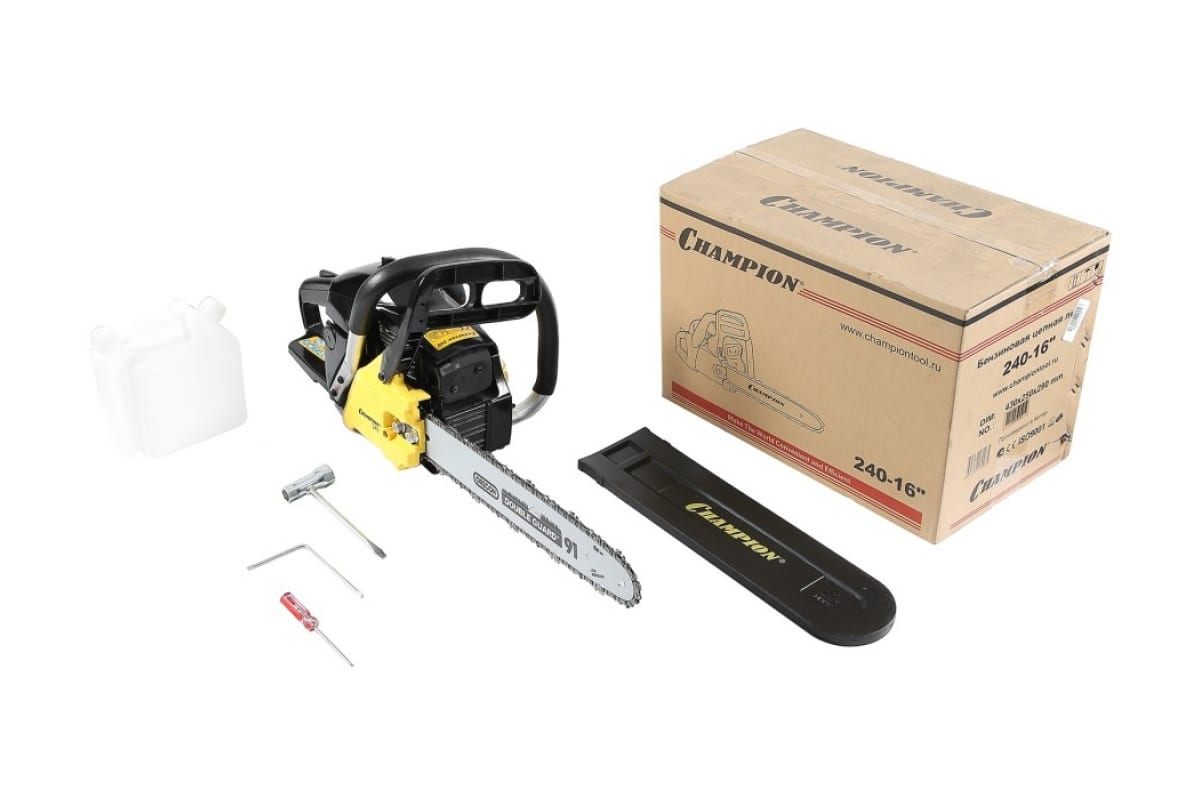 Бензопила CHAMPION 240-16 + подарок - это компактная и производительный инструмент для работы с деревом в домашних условиях. Данная пила имеет небольшой вес, всего 4,3 кг и мощность 2,31 л.с. что позволяет работать с бревнами небольшого размера. Двигатель имеет хороший КПД, поэтому умеренно греется при использовании, корпус обеспечивает быстрый теплоотвод, поэтому цепная пила Champion 240-16 хорошо подходит для длительного непрерывного использования. Длина полотна небольшая — 16 дюймов — поэтому не возникает сложностей при обрезании сучьев в саду даже в глубине кроны. Легкая, компактная и сбалансированная бензопила для применения на садовом участке. Отлично справляется с распиловкой дров, опиливанием деревьев, с большими объемами строительных работ.