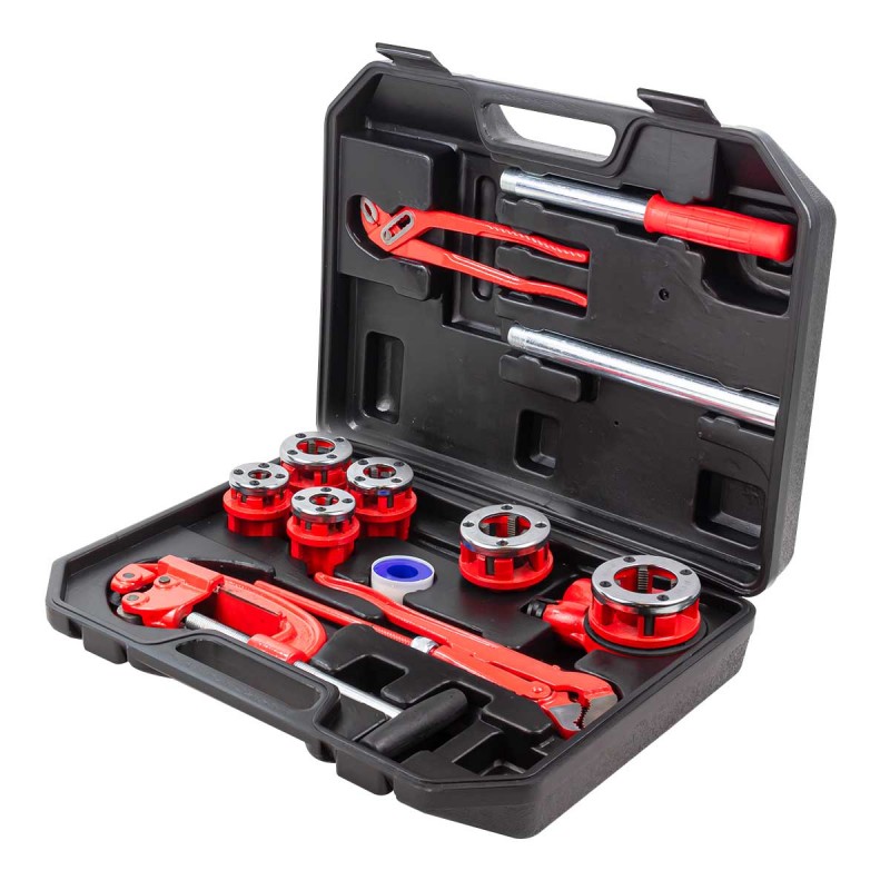 Комплектация: плашкодержатель с трещоткой/клупп, сменные плашки (1/4"", 3/8"", 1/2"", 3/4"", 1"", 1- 1/4""), труборез для стальных труб, клещи, газовый ключ, ФУМ лента, удлинитель, кейс.