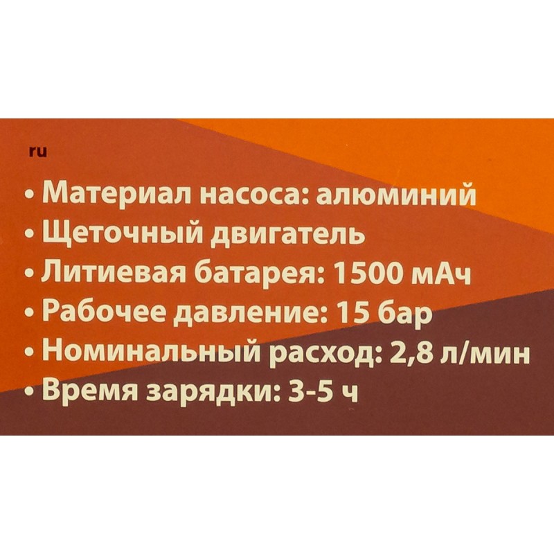 Forsland-PG001 Мойка высокого давления аккумуляторная (12В,15 Бар,2.8 л/мин, батарея 1500 мАч, зарядка 3-5ч, насос аллюминий, щеточный двигатель)