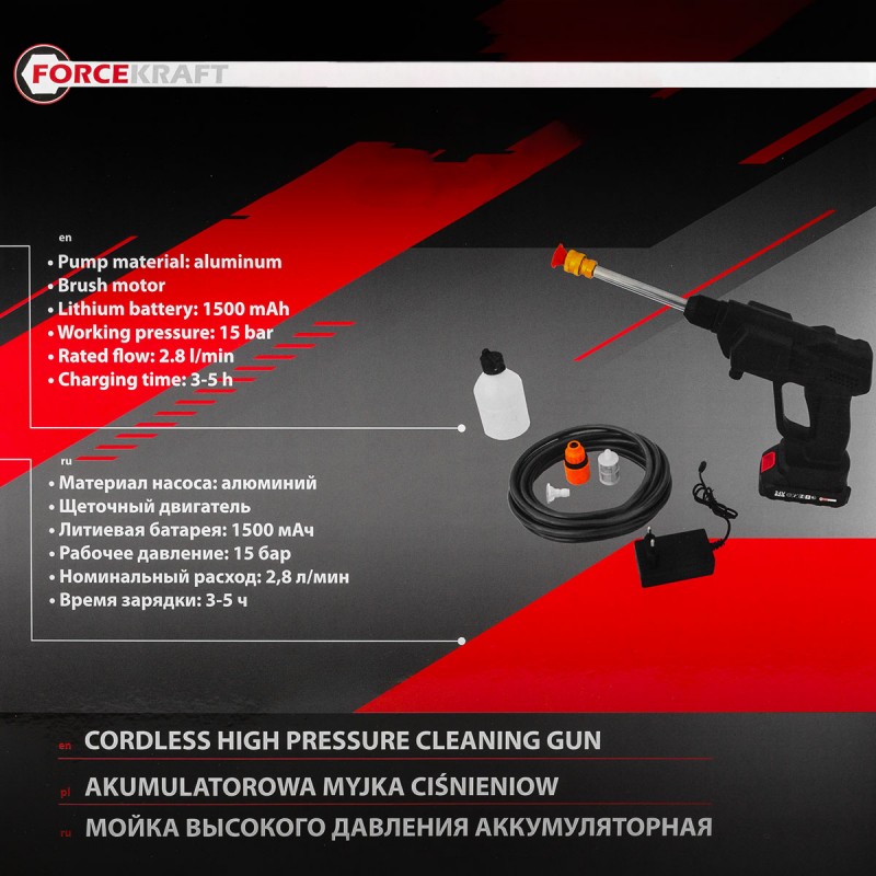 FK-PG001 Мойка высокого давления аккумуляторная (24В,15 Бар,2.8 л/мин, батарея 1500 мАч, зарядка 3-5ч, насос аллюминий, щеточный двигатель)