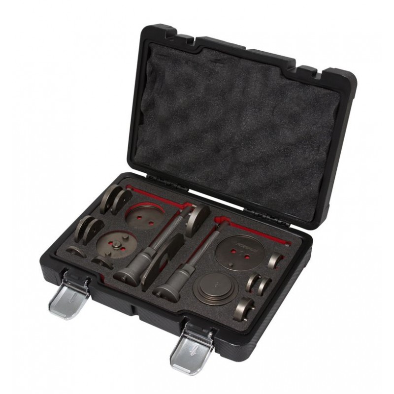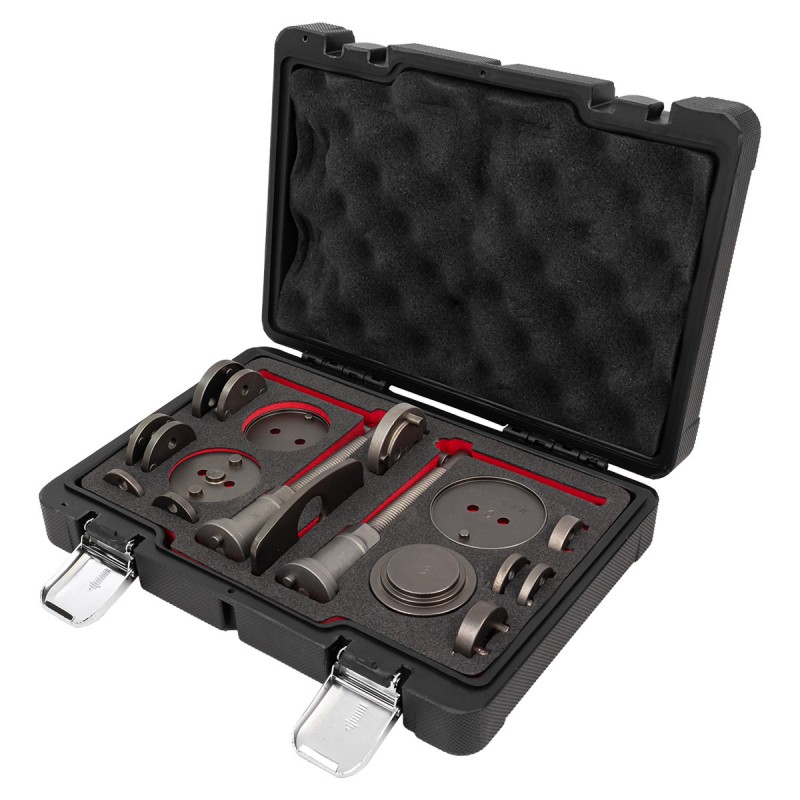 Набор инструментов для обслуживания тормозных цилиндров предназначен для вдавливания цилиндров суппортов автомобилей при ремонте и обслуживании тормозной системы. Разработан для работы с различными типами тормозных цилиндров, включая цилиндры с правым и левым приводами. Это позволяет использовать набор для обслуживания широкого спектра автомобилей. Набор включает в себя различные инструменты, необходимые для выполнения различных операций по обслуживанию тормозных цилиндров, включая снятие, установку, регулировку и замену деталей. Наличие всех необходимых инструментов в одном наборе упрощает и ускоряет процесс обслуживания. Инструменты в наборе изготовлены из прочных и долговечных материалов, таких как высококачественная сталь. Это обеспечивает долговечность и надежность инструментов при выполнении задач по обслуживанию тормозных цилиндров. В состав набора входят: насадки- адаптеры (15 шт.), планка-упор (1 шт.), ключ с левосторонней резьбой ( 1шт.), ключ с правосторонней резьбой (1шт.). Набор поставляется в удобном кейсе "Premium", который облегчает хранение, транспортировку и организацию инструментов.