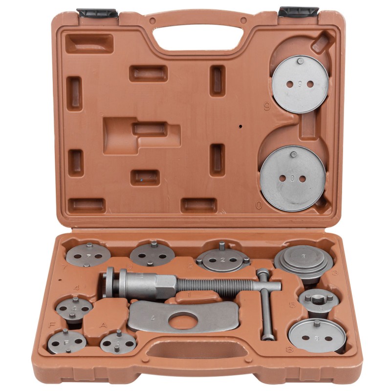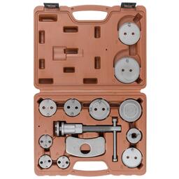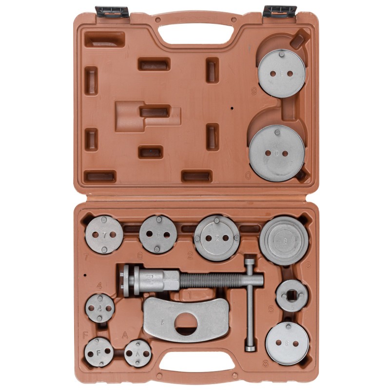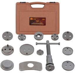 Набор из 13 предметов для обслуживания тормозных цилиндров редназначен для возврата поршней дисковых тормозных механизмов. Применяется при ремонте и обслуживании суппортов дисковых тормозов легковых автомобилей. Принцип действия данного инструмента основан на воздействии путем совмещения двух усилий, вращательного, перпендикулярно оси вращения поршня и осевого, для возврата в исходное положение поршня рабочего цилиндра тормозного суппорта. Комплектация: ключ с правосторонней резьбой 1 шт., упорная планка 1 шт., насадки-адаптеры 11шт., кейс.