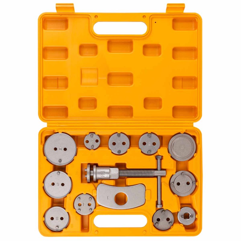 Набор из 13 предметов для обслуживания тормозных цилиндров редназначен для возврата поршней дисковых тормозных механизмов. Применяется при ремонте и обслуживании суппортов дисковых тормозов легковых автомобилей. Принцип действия данного инструмента основан на воздействии путем совмещения двух усилий, вращательного, перпендикулярно оси вращения поршня и осевого, для возврата в исходное положение поршня рабочего цилиндра тормозного суппорта. Комплектация: ключ с правосторонней резьбой 1 шт., упорная планка 1 шт., насадки-адаптеры 11шт., кейс.