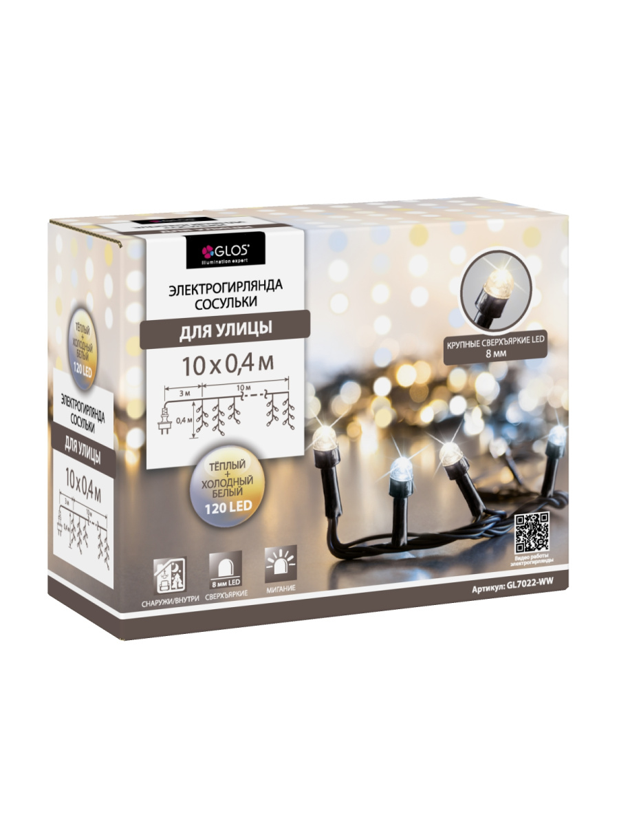 Электрогирлянда GLOS Сосульки 10х0,4м, 120 тёпл. бел., арт. GL7022-WW