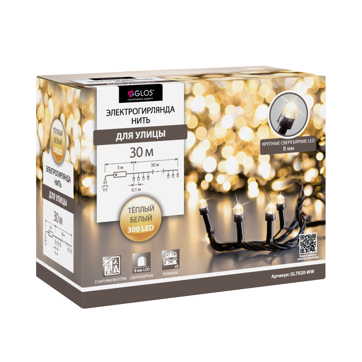 Электрогирлянда GLOS «Нить» 30м, 300 тёпл. бел. светодиодов, арт. GL7020-WW