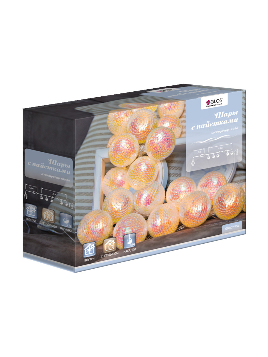 Электрогирлянда GLOS Шары с пайетками 1,8м, 10 тёпл. бел., арт. GL0107-WW