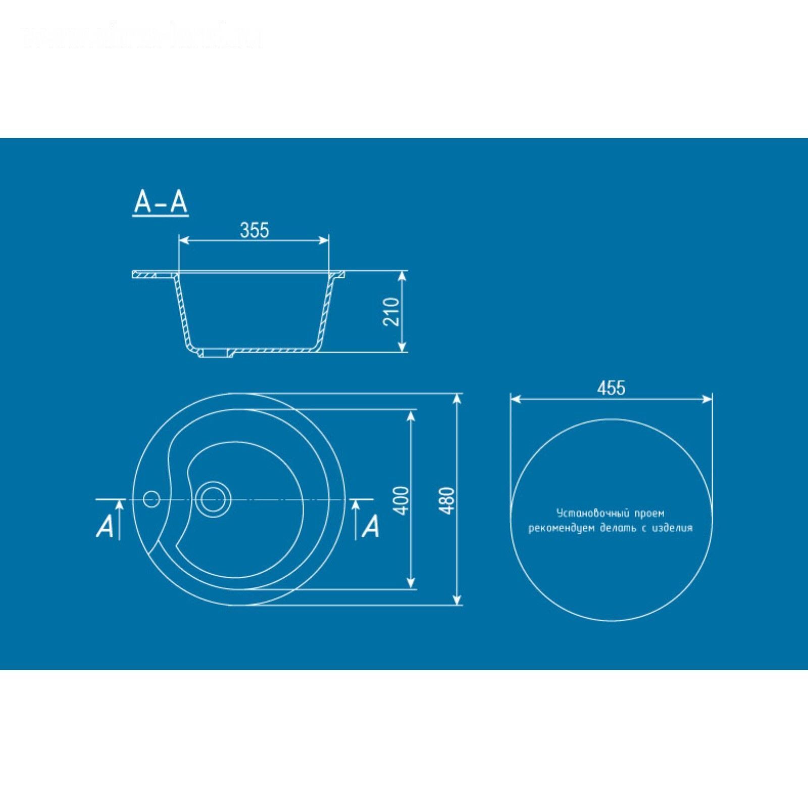 Круглая мойка из искусственного камня. Модель Ulgran U-102. Мойка имеет отверстие под смеситель и необычный дизайн отделки бортика мойки.