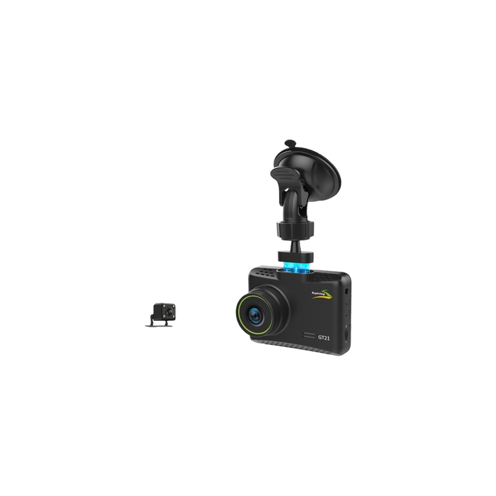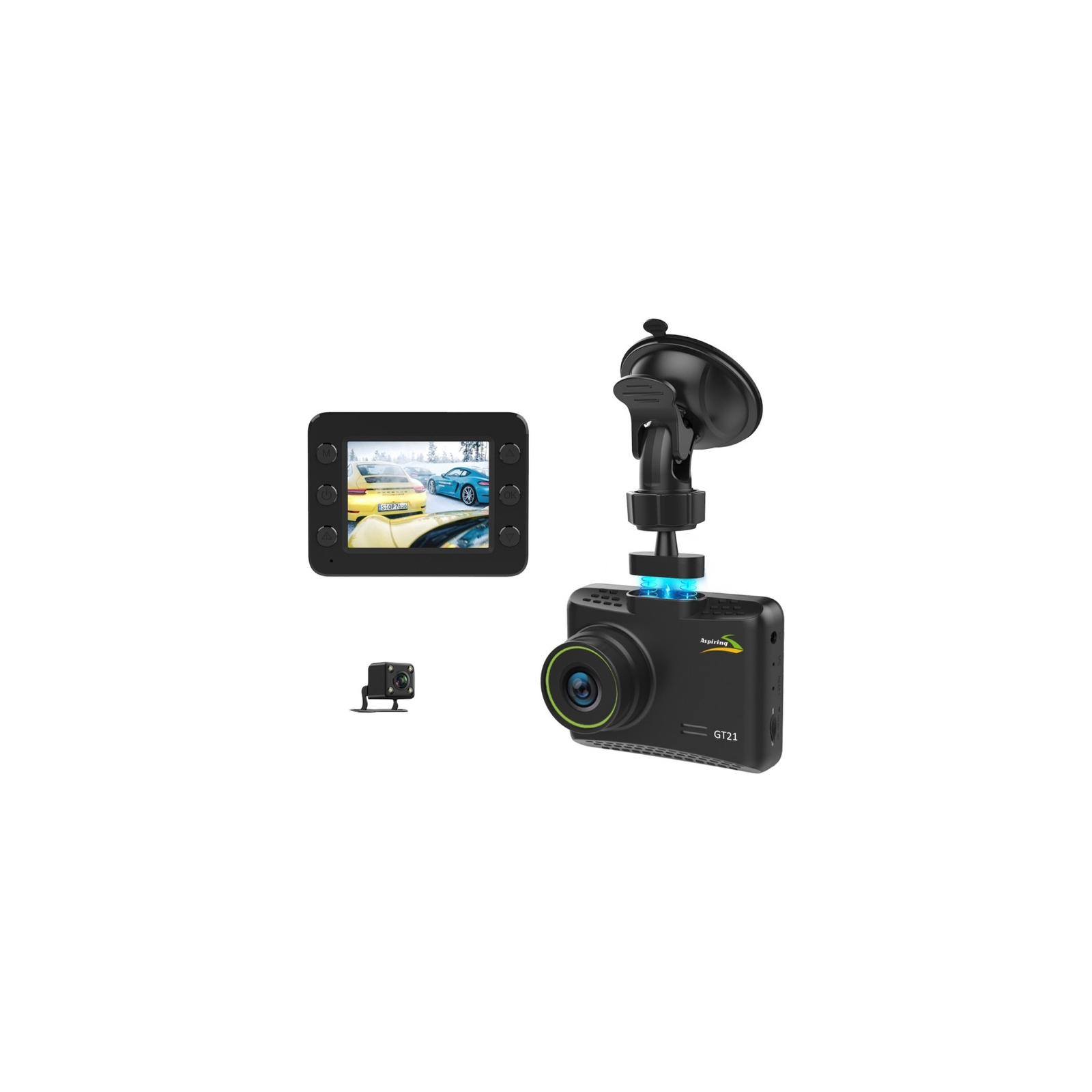 Aspiring GT21 DUAL FHD – це простий у використанні відеореєстратор з високою роздільною здатністю, оснащений дисплеєм 2,5″. Завдяки широкому куту огляду в 170° забезпечується охоплення всієї дороги.