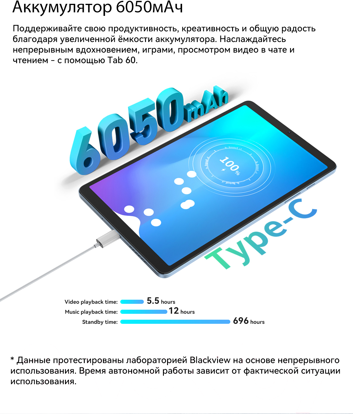 • Емкость аккумулятора 6050 мАч (общее время зарядки: 3.5 часа )