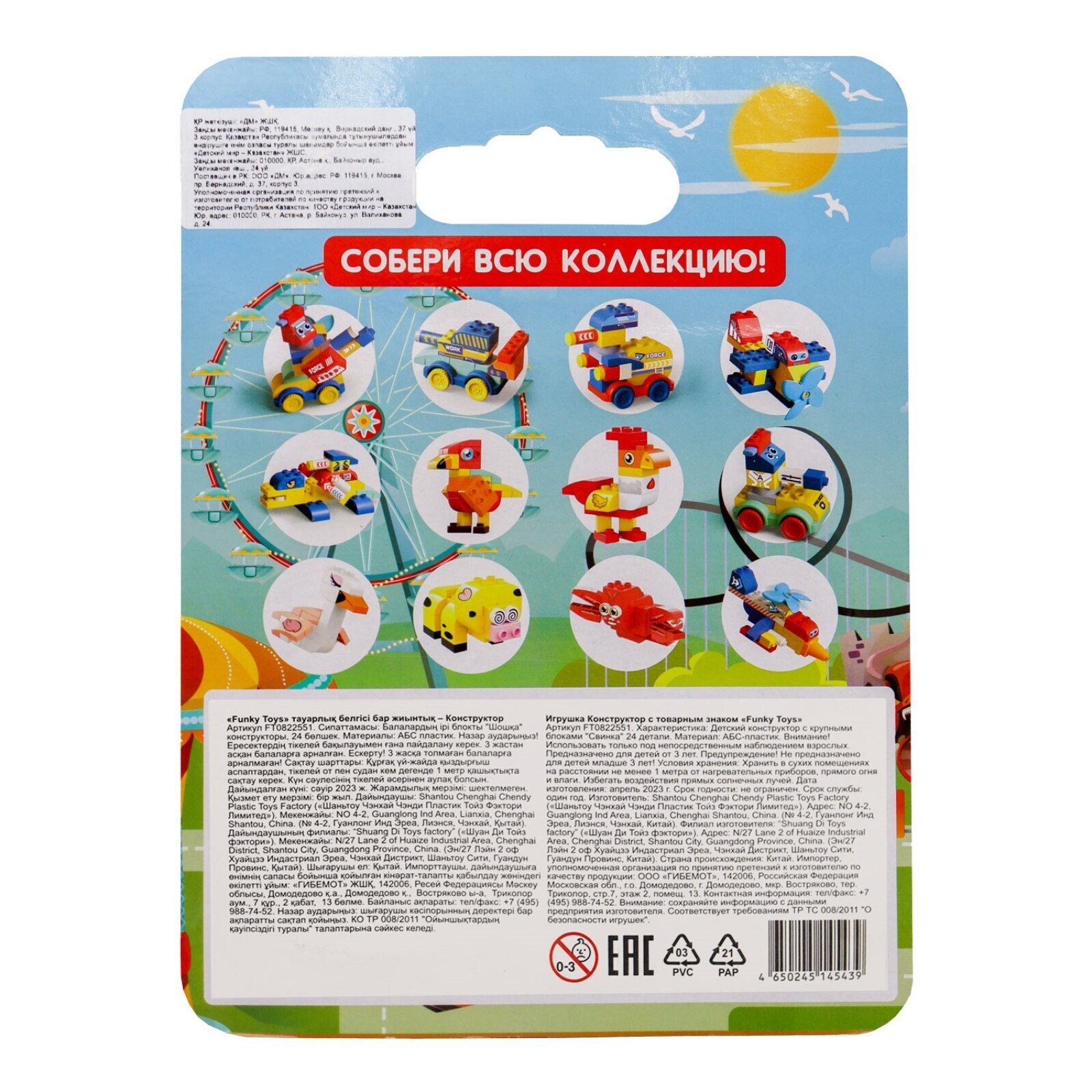 Детский развивающий конструктор от Funky Toys - отличная игра для детей старше 3-х лет. Каждый набор предлагает собрать своего персонажа, животное, танк и даже самолёт! В игровой набор входят крупные блоки, инструкция и наклейки, которыми можно дополнить игрушку! Некоторые детали конструктора подвижные за счёт шарниров, что придаёт игре реалистичности. Конструктор Funky Toys позволит весело и с пользой провести время с ребёнком, поможет развить творческие навыки, мелкую моторику, логическое мышление. Собранную игрушку можно брать на улицу, в поездки, путешествия, школу и детский сад, на дачу и т.д. Блоки крепко скрепляются между собой. Детский яркий конструктор - идеальный подарок как для мальчиков, так и для девочек. Блоки выполнены из безопасного ABS-пластика, нетоксичного для ребёнка и не имеющего запаха. Рекомендуется не оставлять ребёнка наедине с конструктором во избежание проглатывания деталей.