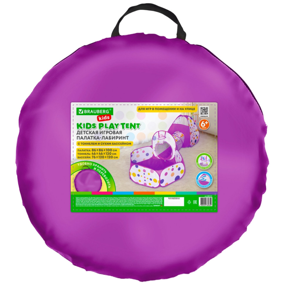 Детская игровая палатка-лабиринт BRAUBERG KIDS предоставляют детям идеальное индивидуальное пространство для игр, движения, веселья с друзьями, чтения или сна. Она подходит для использования в помещении или на улице. Детская игровая палатка-лабиринт BRAUBERG KIDS оснащена тоннелем и сухим бассейном с баскетбольным кольцом (шарики в комплект не входят). При этом все 3 элемента компактно упакованы в небольшую сумку размером 50х50х4 см. Каждый элемент легко раскладывается и быстро складывает. Размеры каждого элемента палатки:Палатка – 86х86х100 см. Тоннель – 120x46 см.Сухой бассейн с кольцом – 120х120х76 см.Примерные размеры собранного изделия - 270*120*100 см.Элементы можно использовать как вместе, так и отдельно друг от друга – они фиксируются между собой специальными крепежами-пуговицами. Яркий и красочный дизайн, подходящий как девочкам, так и мальчикам, не останется без внимания. Каждый элемент набора оснащен москитной сеткой, благодаря чему внутри всегда будет свежий воздух и защита от солнца. На текстильном прочном дне внутри палатки удобно сидеть.Дверь палатки поднимается, сворачиваясь в рулон наверху, и фиксируется завязкой. Палатка изготовлена из текстильных синтетических материалов с пластиковыми элементами и легко моется губкой в случае загрязнения. Быстросборный пластиковый механизм домика с текстильным прочным дном особенно удобен для путешествий на природу, в парк, на дачу или в гости, чтобы весело провесит время одному или с друзьями.Сухой бассейн можно использовать как в качестве манежа для малыша, наполнив его шариками (в комплект не входят), так и как базу для тренировки крупной моторики – бросать шарики в кольцо, стоя за пределами палатки. При этом ребенок развивает координацию движений, глазомер и меткость. Из палатки по тоннелю до сухого бассейна можно устроить настоящую полосу препятствий. Такое занятие надолго увлечет даже непоседу, тренируя при этом ловкость, быстроту и гибкость.Детская игровая палатка-лабиринт с тоннелем и сухим бассейном – это готовая игровая площадка, незаменимая для сюжетно-ролевых игр, где ребенок может придумать множество вариантов декора любимого места игр и отдыха, укрыться от мира взрослых и почувствовать себя полноправным хозяином собственного уголка, куда можно приглашать гостей и устанавливать свои правила, что способствует развитию фантазии. Палатка сертифицирована, безопасна и настолько прочна, что выдержит активную игру даже малышей. У игрового домика мягкая конструкция и отсутствуют острые углы. Тип товара: детская игровая палатка. Серия: С туннелем. Количество предметов в комплекте: 3 шт.. Материал: комбинированные текстильные материалы. Возрастная группа: от 3 лет. Пол : универсальный. Сюжет: С сухим бассейном. Длина собранного изделия: 270 см. Ширина собранного изделия: 120 см. Высота собранного изделия: 100 см. Упаковка: текстильная сумка Бренд - BRAUBERG. Производитель - Китай. Артикул - 665172. Штрихкод - 4606224380650
