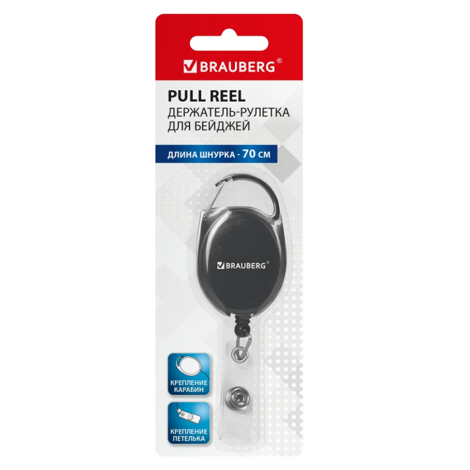Данное описание относится к 1 единице из набора. Держатель-рулетка BRAUBERG предназначена для крепления бейджей, магнитных карт, пропусков, ключей и мелкого инструмента. Рулетка с карабином подходит для ношения на поясе. Длина черного шнурка 70 см. Пластиковый корпус черного цвета. Упакована в блистер с европодвесом. Тип держателя: держатель-рулетка. Серия: Badge holder. Вид крепления держателя: карабин. Количество в упаковке: 1 шт. Материал: пластик. Длина нити в держателе-рулетке: 70 см. Цвет ленты/шнурка: черный. Цвет корпуса: черный. Упаковка: блистер с европодвесом Бренд - BRAUBERG. Производитель - Китай. . Штрихкод - 4606224401331