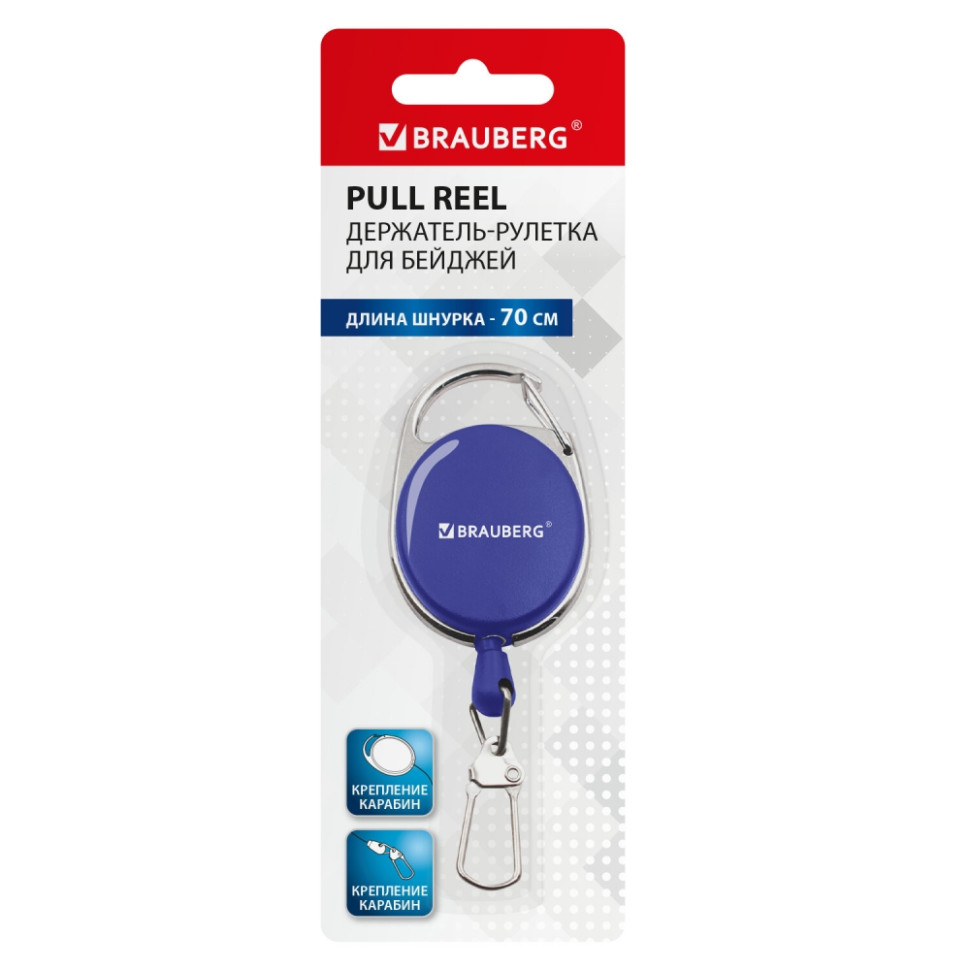 Данное описание относится к 1 единице из набора. Держатель-рулетка BRAUBERG предназначена для крепления бейджей, магнитных карт, пропусков, ключей и мелкого инструмента. Рулетка с двумя карабинами подходит для ношения на поясе. Длина черного шнурка 70 см. Пластиковый корпус синего цвета. Упакована в блистер с европодвесом. Тип держателя: держатель-рулетка. Серия: Badge holder. Вид крепления держателя: карабин. Количество в упаковке: 1 шт. Материал: пластик. Длина нити в держателе-рулетке: 70 см. Цвет ленты/шнурка: черный. Цвет корпуса: синий. Упаковка: блистер с европодвесом Бренд - BRAUBERG. Производитель - Китай. . Штрихкод - 4606224401355