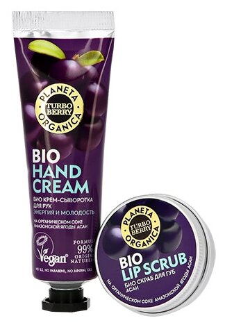 - В наборе био крем-сыворотка для рук Энергия и молодость Асаи 30 мл, био скраб для губ Энергия и молодость Асаи 15 мл