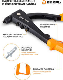 ОписаниеТипы заклепок: сталь/алюминий/нержавеющая сталь; Тип изделия: усиленный. В комплект входят 4 насадки под диаметры 2.4, 3.2, 4.0, 4.8 мм. и ключ для их замены. Насадки крепятся на инструмент, что создает дополнительное удобство в работе. Макс. скрепляемая толщина - 45 мм.