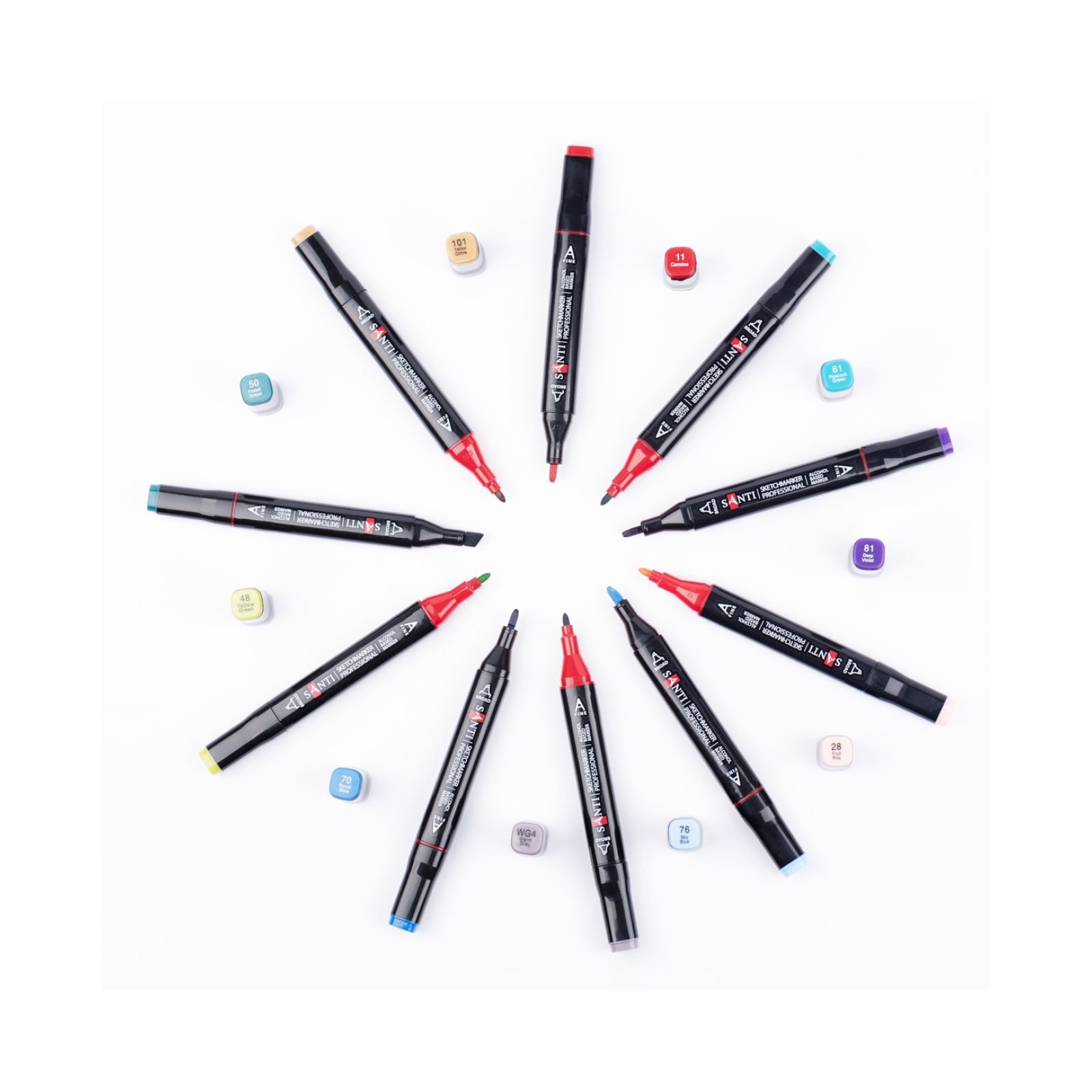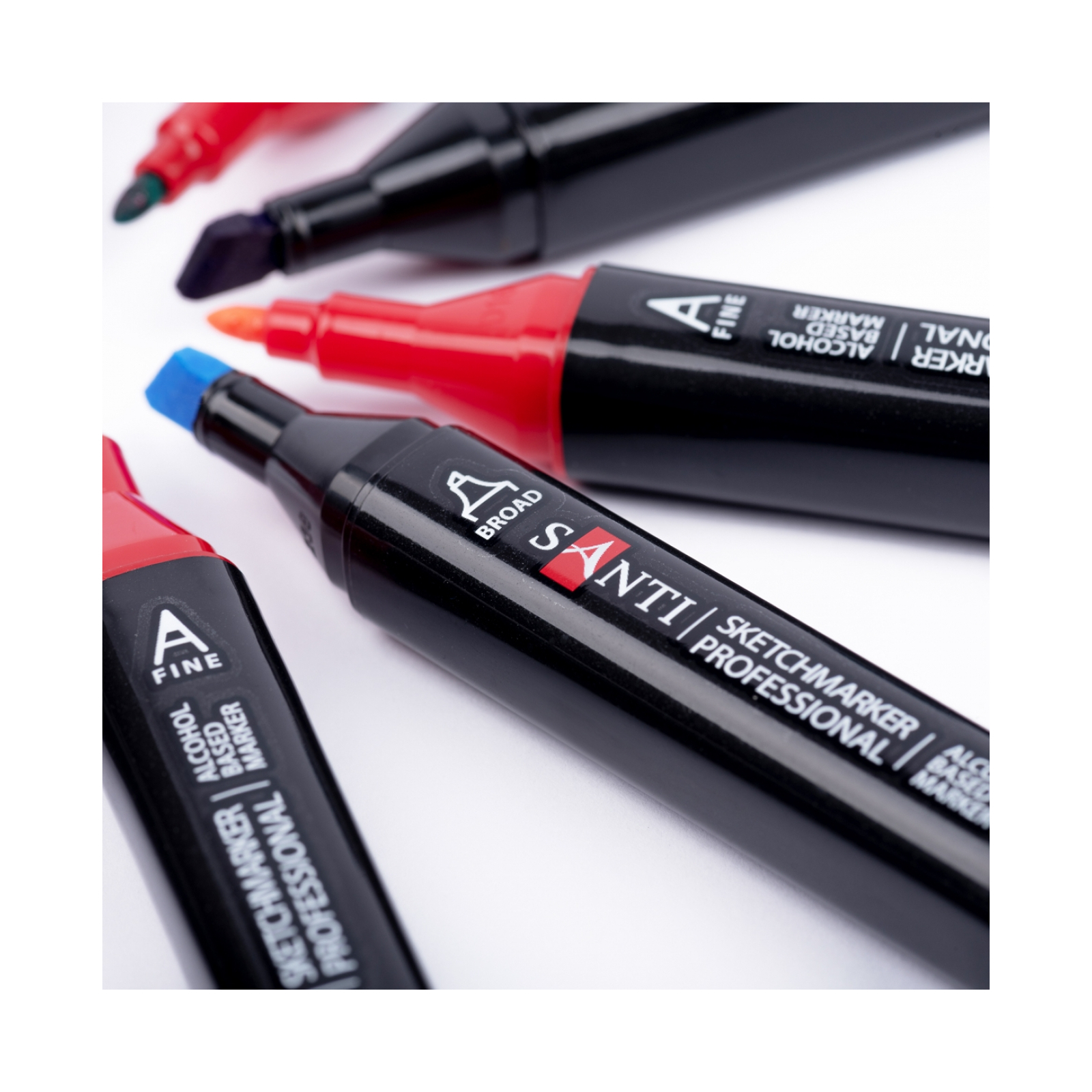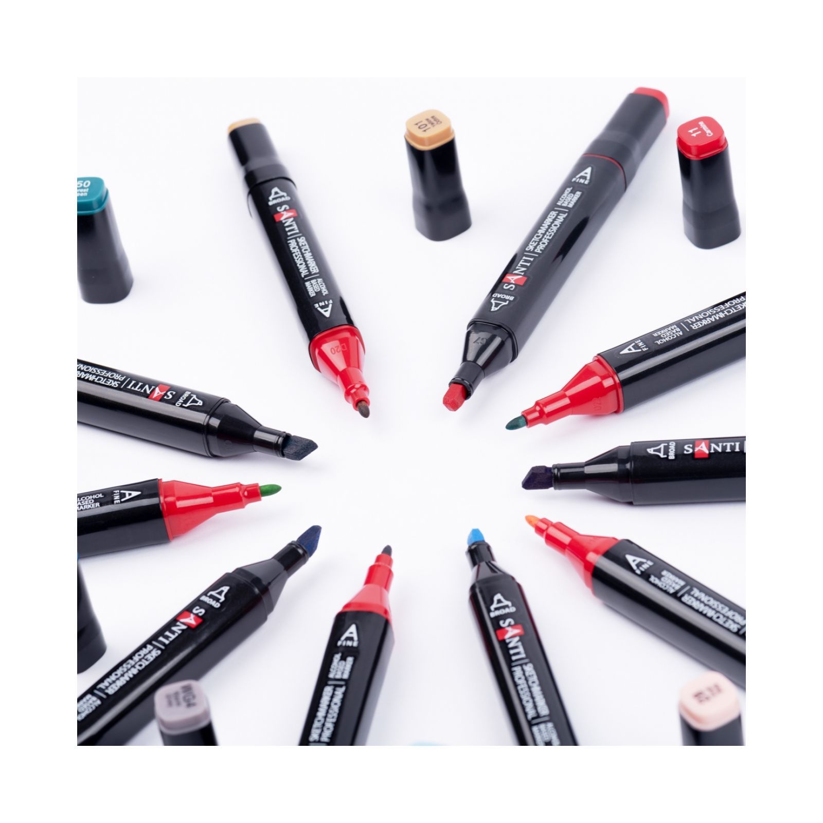 Набір спиртових маркерів SANTI «SKETCHMARKER professional» 24 PCS для малювання. Підходять для створення будь-яких художніх робіт в різних техніках, включаючи стетчінг, каліграфію та ілюстрування. У наборі 24 маркера різного кольору, для зручності маркування кольору нанесене на ковпачок. Кожен маркер має два наконечника різної форми: загострений наконечник для тонких ліній та плоский зі скошеним стрижнем для широких штрихів. Чорнила на спиртовій основі і добре вбираються в папір, рекомендується використовувати для малювання спеціальні альбоми, щільні аркуші паперу або картон. Кольори добре змішуються між собою. Корпус виготовлений з поліпропілену.