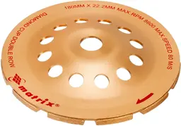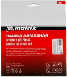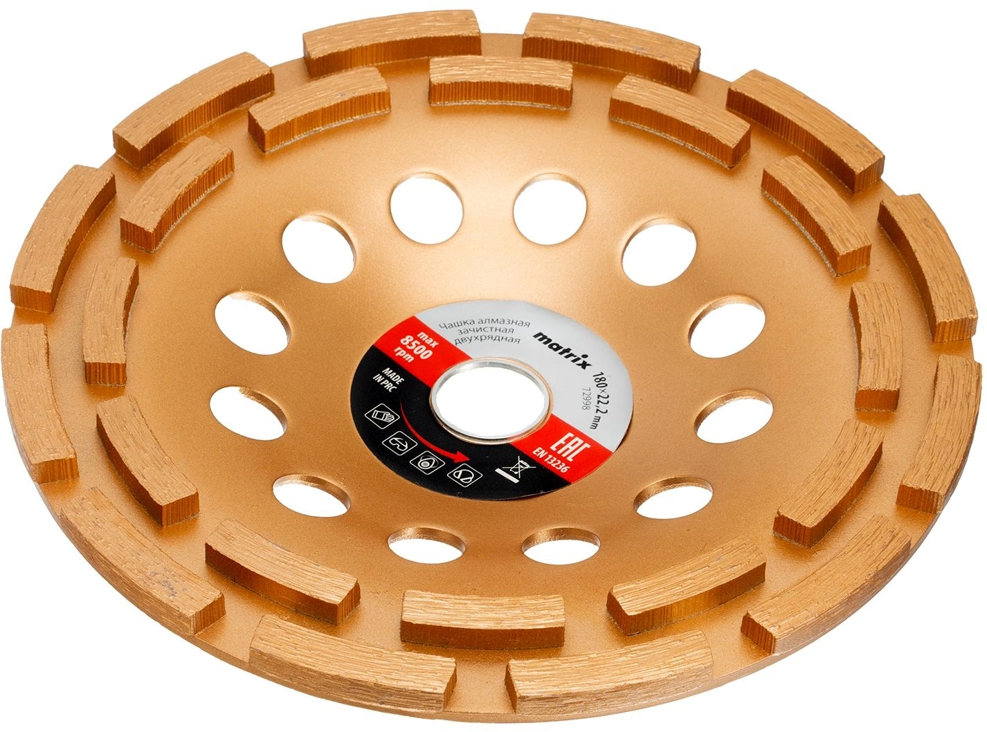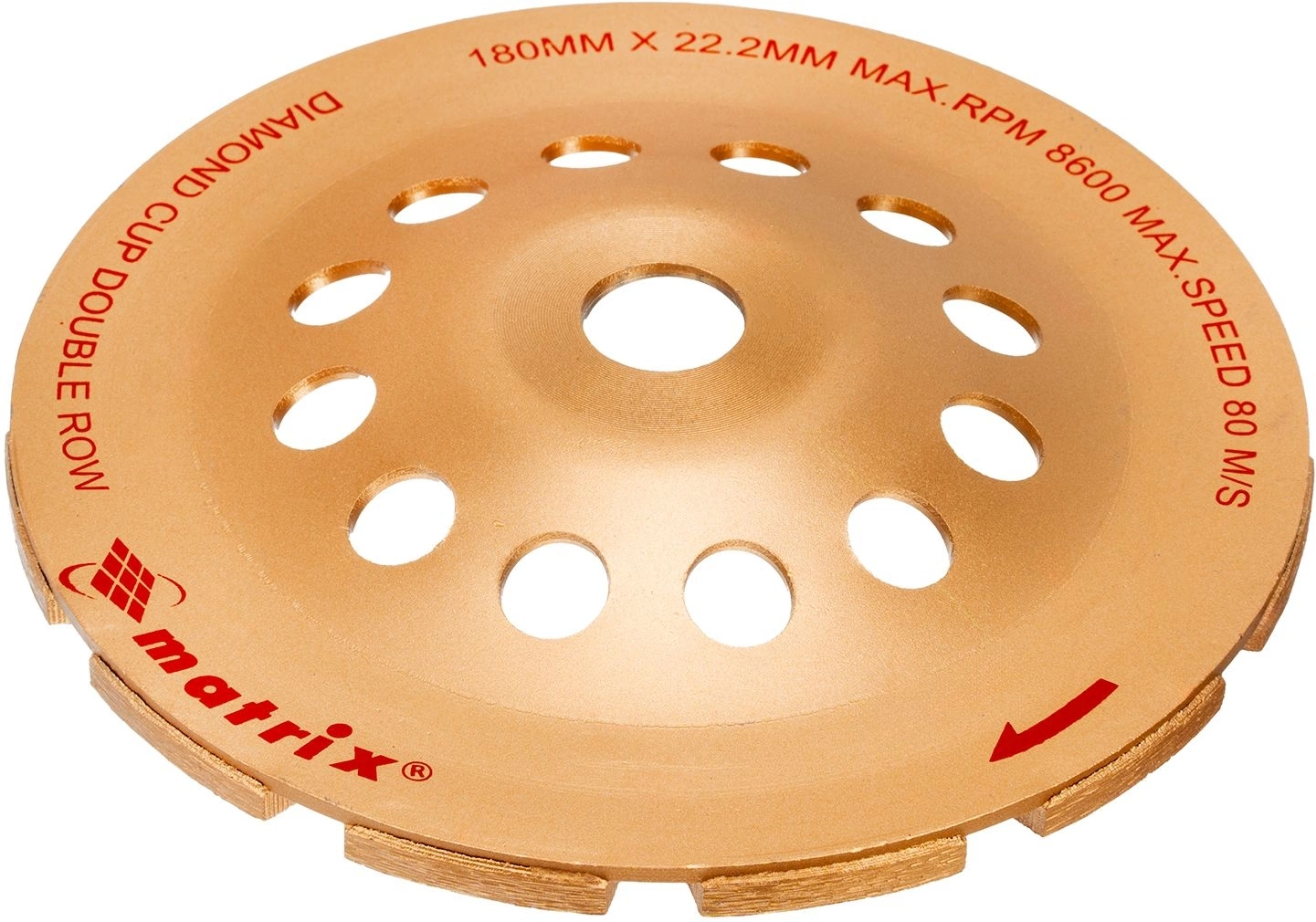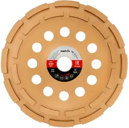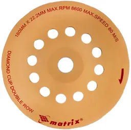 ОписаниеЧашка алмазная "Двухрядная" ТМ Matrix предназначена для интенсивной грубой зачистки бетона, мрамора, камня, кирпича, гранита. Данный тип чашки рекомендуется для снятия толстых слоев бетона, удаления швов и наплывов после опалубки.