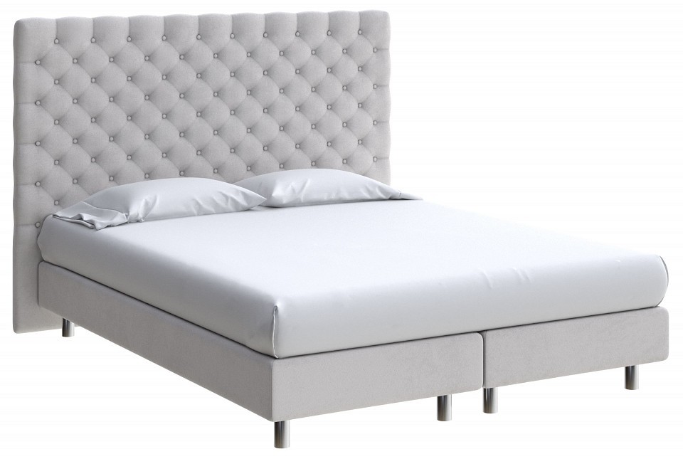 Длина спального места, мм: 2000, Ширина спального места, мм: 900, Цвет обивки: серый камень Ultra, Материал обивки: велюр, Материал корпуса: МДФ, фанера, Художественное описание товара: Высокое изголовье кровати Paris украшено стежкой-капитоне. Это придает особую элегантность и воплощение французской классики. Наибольшую популярность во всей Европе этот декоративный элемент обрел к середине XIX века. В комплекте Boxspring Elite - основание с пружинным блоком Bonnell, который обеспечивает равномерное распределение нагрузки на всю поверхность спального места и снижает нагрузку на матрас, что значительно увеличивает срок службы. Каркас основания выполнен из высококачественных материалов: МДФ и фанеры, усиленной внутри ребрами жесткости. Ножки круглые в сечении, выполненные из металла цвета хром. Односпальный размер основания (800/900/1000 мм) имеет систему крепления между собой., Дополнительные параметры: Высота спального места от пола - 300 мм, толщина изголовья - 80 мм, высота опор - 100 мм, высота бокса - 200 мм.